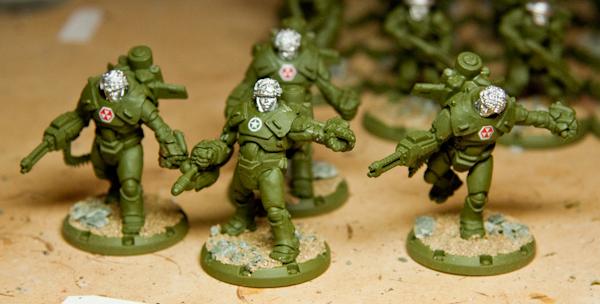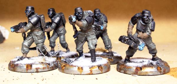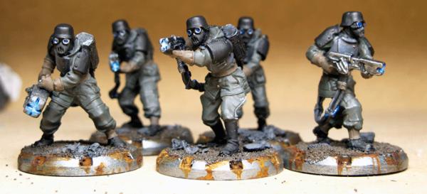 The first step forwards was improving the colours being used for the germans. Originally I had the rifles and the gasmask canisters as bare metal... this looked a bit rubbish to be honest and, looking at some ww2 historicals painting guides, wrong. I've used a different shade of green (VMC German Fieldgrey WW2) to do the canisters, rifle grips and handles. This is all being shaded with the USA Olive as well. So far, this is looking much better. When I go back and do the chipping on the armour, I'll beat up these bits as well.