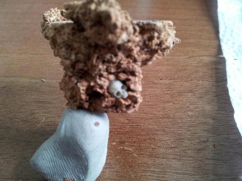 Once you got up to the hight you like, you can tear away pieces of cork to get the shape you want your base to be. I used a dental tool for this. You can also add stuff like roots, plastic H-beams for urban enviorments or like in my case, skulls to the base to make it look more interesting.