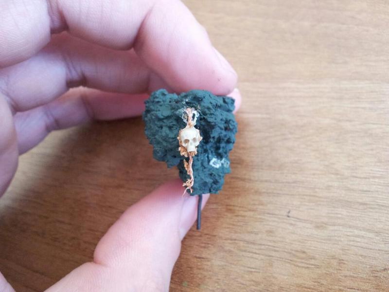 Once your done, give your base a swirl to see if its really done or if it needs more detail. My base was kind of bland on one side so I've added a root entangled skull to one of the sides. i used very thin copper wire to create the root. I glued tiny bits of cork to it to make it look like it was recently ripped out of its soil.