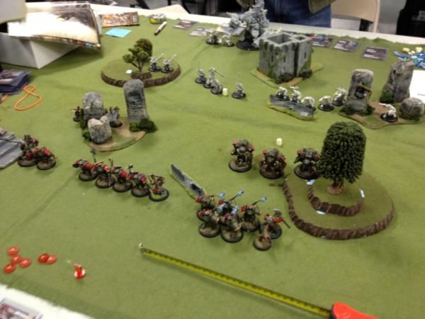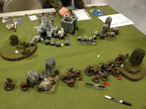 The Butcher has surrounded himself with his sturdiest machines of war, the heaviest of which have been thundering ahead of his two units of Man-O-Wars. He sends a command to their cortexes to pause and wait for the entire force to catch up, while he bids one unit of Man-O-Wars to make their flesh harder than that of iron. A horde of savages has been glimpsed by his Marksmen on the right flank, and his Manhunter on the left. It is time to draw the battle lines...