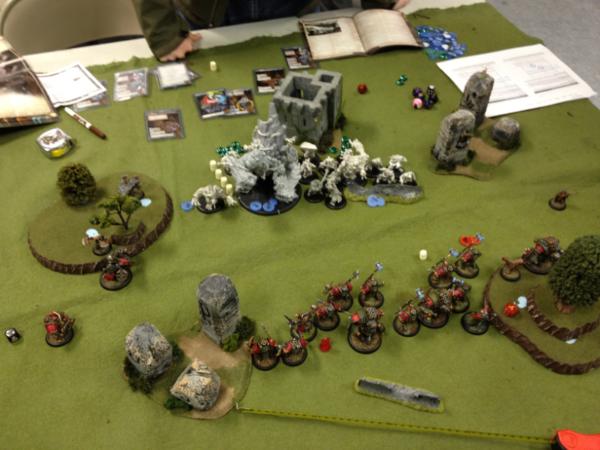 Doomshaper needs no invitation to call his followers to war; indeed he rarely pauses for breath without doing so. Yet in this case something about the steel wall in front of his beloved Dire Trolls, hard as rock their own flesh may be, causes him to take caution. Several scouts willingly sacrifice their lives to buy time for their larger kin. The krielstone bearer invokes the aura of stone and bids their flesh to become like that of his heavy burden. Janissa Stonetide lives up to her name and calls forth the rocks of the plain to create a wall, while the Doomshaper casts the animus of the Earthborn to even further boost the armor of the other Dires. Then he waits to see what the iron and steel monsters will attempt...