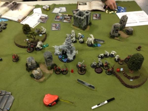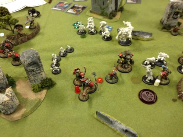 Doomshaper hears a rumbling in the distance, not unlike a landslide in the mountains... but they are travelling in the plains. Quickly, he sends forward his two units of scouts before following up with his warbeasts behind. The skin-hardening aura of the krielstone that a loyal trollblood is hauling into battle is not yet needed, and Janissa and the scribes run along with the beasts.