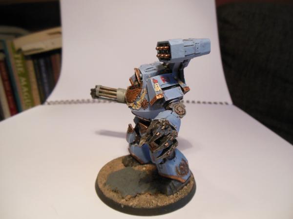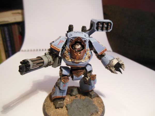 I really like this Contemptor, the colour scheme (particularly the head), the carbon scoring on the assault cannon and the addition of the alternate launcher make it special. If you would like some advice, I would suggest you add some more shading and highlighting to the chest-eagle. It just looks a little flat and I know those browns/copper metallics can be painted with great depth.