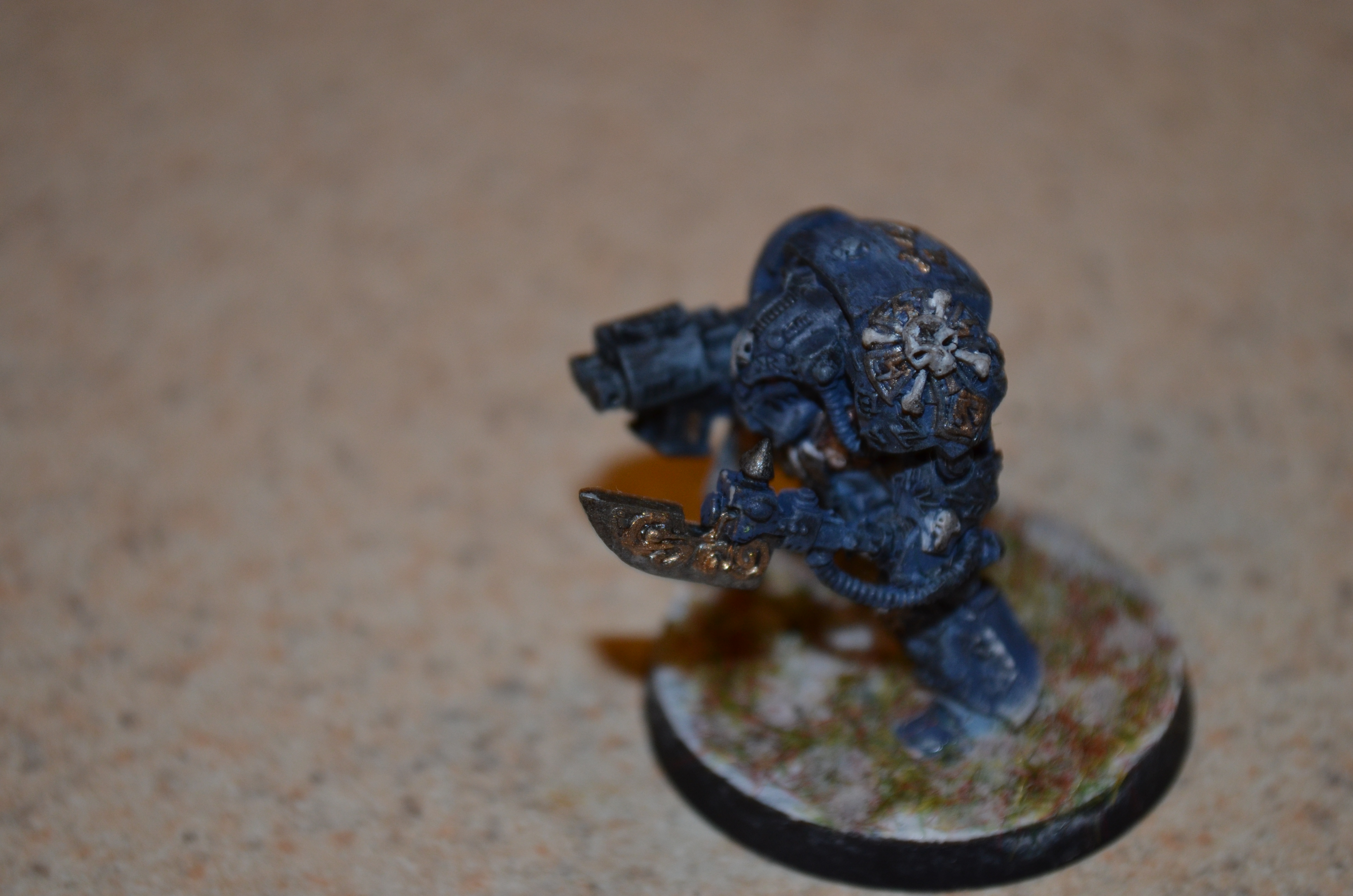 It's hard to do a proper drybrush on flat surfaces like a power armor or terminator armor. You should not really drybrush them, but edge highlight them. You get a much smoother finish like that. The model looks ok, but could be a lot better. Some of the details have been left unpainted and some are just a bit untidy. Still a nice first submission. Keep at it! Practice makes perfect or atleast better