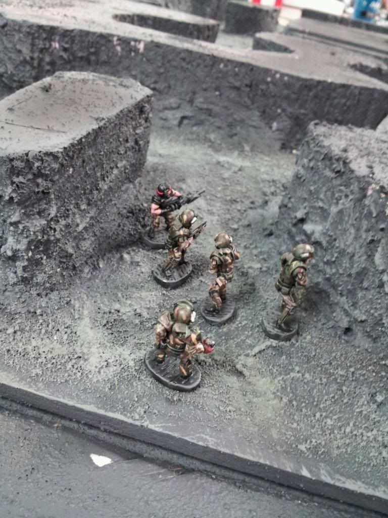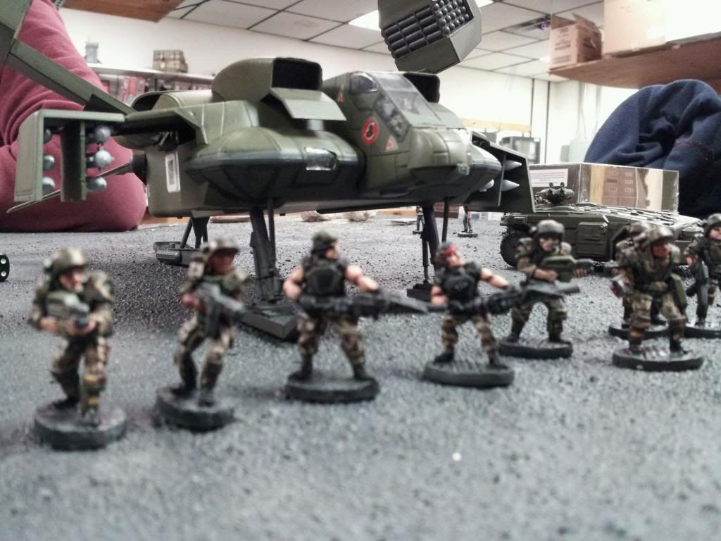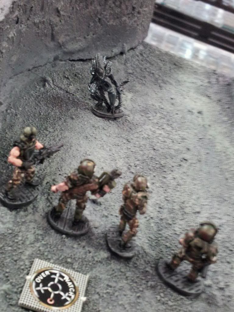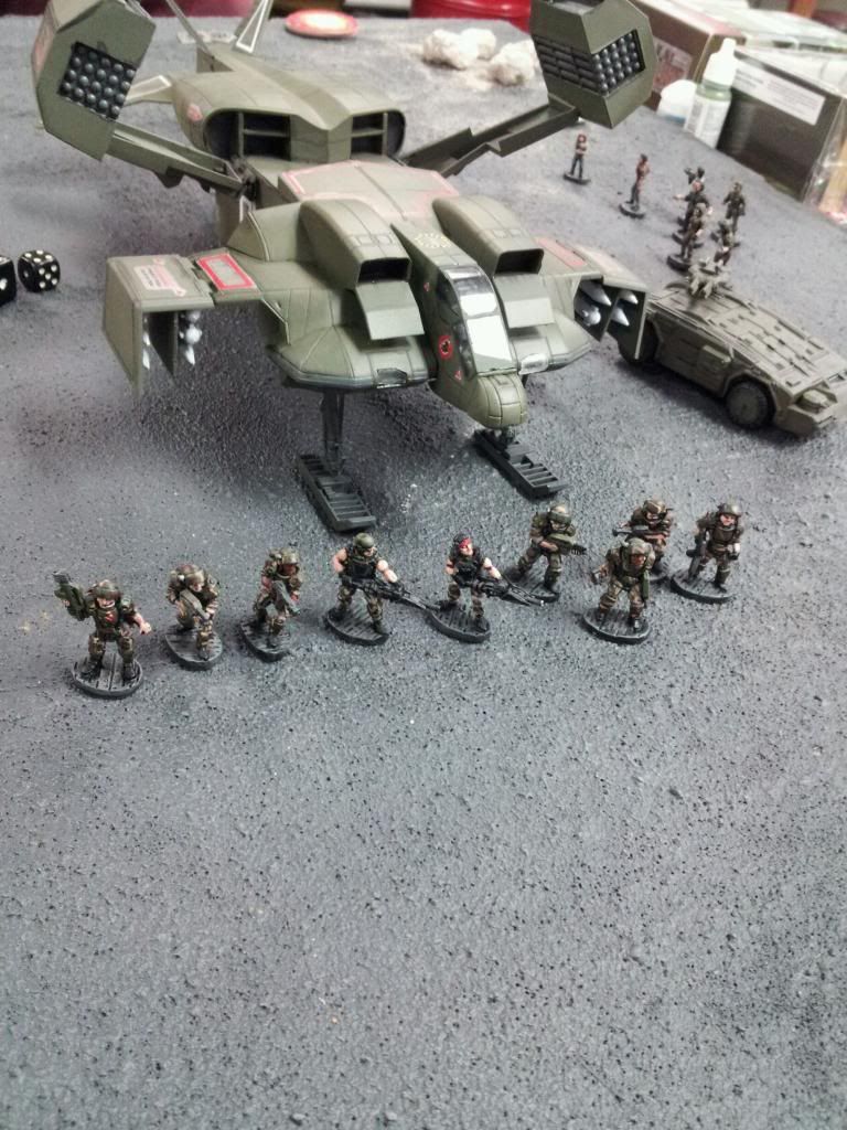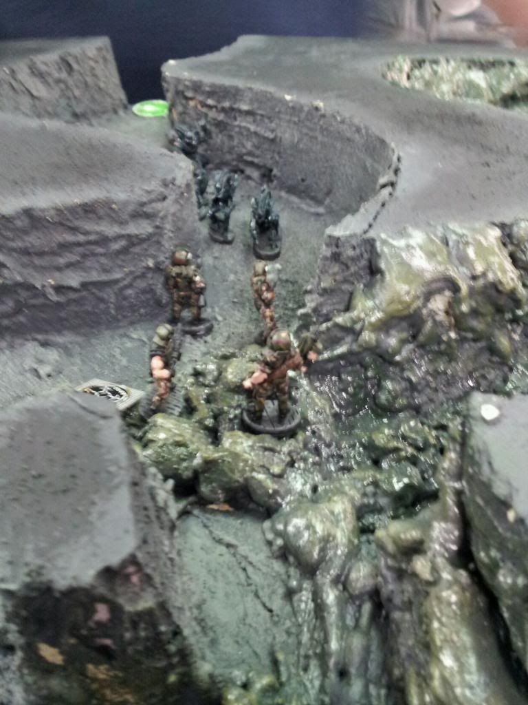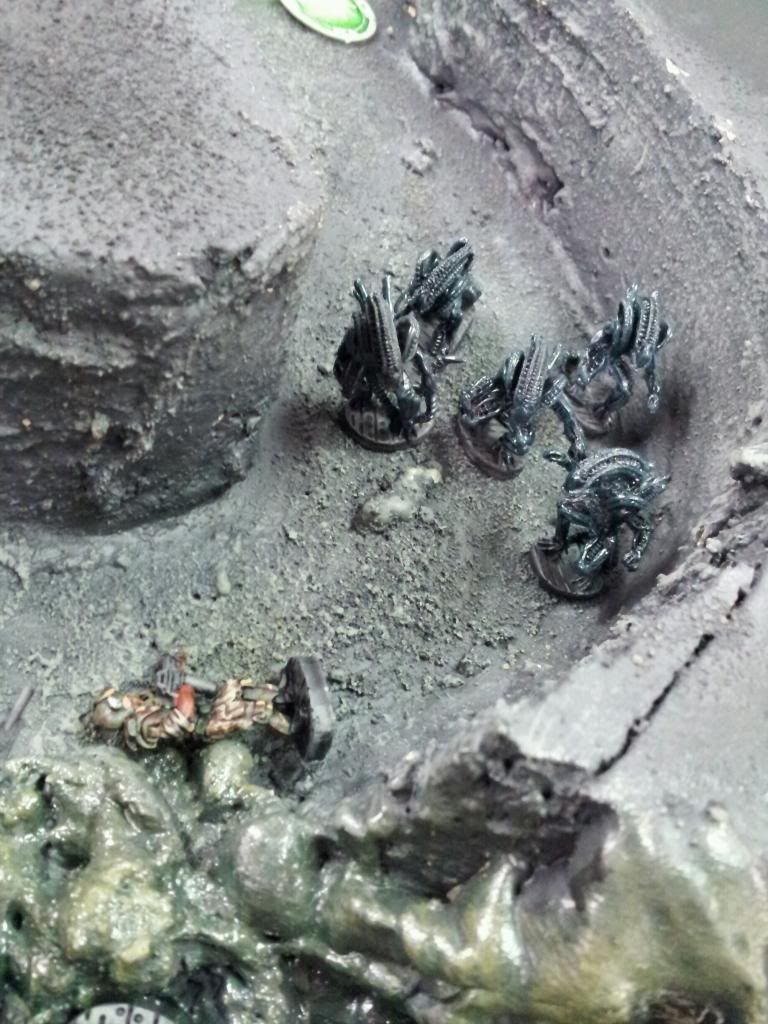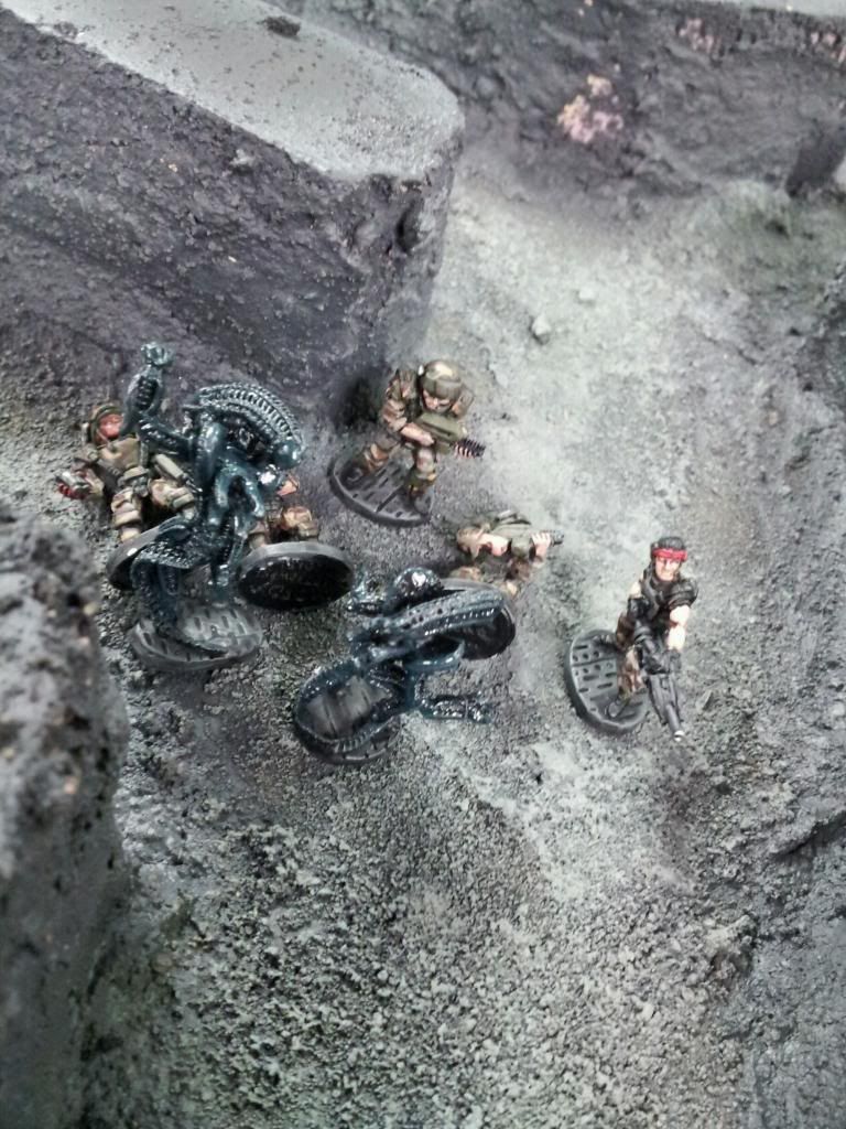 i have a bunch of the old 1990s leading edge games colonial marines and aliens and drop ship and some other stuff . i have my 4 x4 bug cave board i did for the war store weekend mega starship trooper battle i did . so i wanted to do a game with them . so scracthed out a set of space hulk inspired rules with a little more crunch . and away we went on another bug hunt ! the marine squad dropped down via dropship in the pipe 5x5 . the marines rolled out spliting in two teams to cover more ground . their objecives were to find any colonists stuck in the mining tunnels , if possible locate a generator that would power up a local way station , and kill any xenos they would come into contact with . mission went smoothly at first ( as it always does ) the marines droped any alien that they came across . the teams smart gunners laying down heaps of fire power when need . we played with the rules that some alien encounters had a chance of a special ambush rule on a roll of a dice called " there coming out of the god damn walls!!!" it happened to one of the teams . close quarters with aliens is no fun ! also when they get hit with explosive tipped rounds and acid blood sprays every where . team 1 was now tending to there wounded and covering the hall ways as more xenos race from different tunnels towards them . finally they were brought down . team 2 faring better engaged aliens with ease and made it to the edge of the hive . they too had some fierce close encounters and soon were fighting for survival . drakes smart gun jamed . quickly the team reorginized it self . fighting on . but the swarm became to much the brae and finally the colonial marines went down , taking as many bugs as they could down . great game . we did an after action report after words and discussed some rule changes well do next time . and discussed what we would do differntly next time . over all a blast of time . my friend constanly played sound effects from the movie of pulse rifle , smart gun and alien screams from his smart phone further enriching the game ! well thats it ...GAME OVER MAN !!enjoy the pics