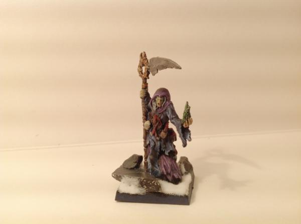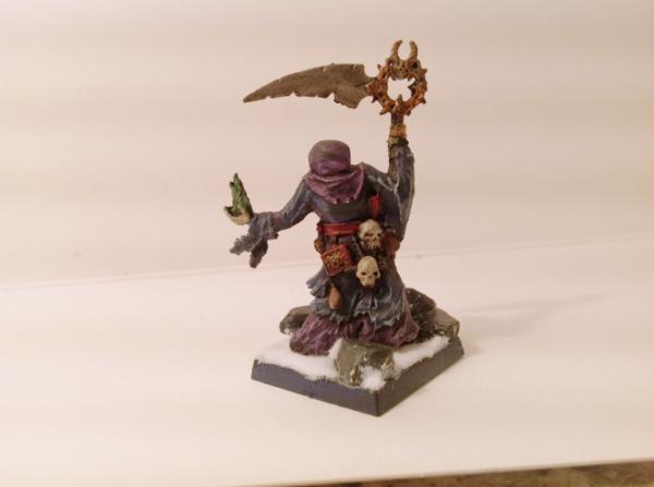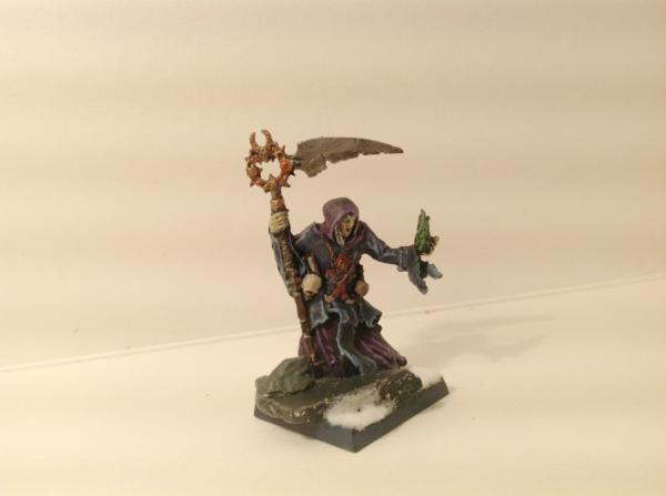 Contrast - The darker colors make sense for a necromancer model, but the contrast of the highlights is so low (looks like very soft drybrushing?) that they get lost, more or less. I'd suggest either taking the base darker or the highlights lighter (or both, but to a lesser degree) to make them pop a bit more. The eye will still "fill in the blanks" and assume the proper colors, even if you take the base down to a near-black, so long as the highlights are sufficiently saturated. Actually, I think darker base colors and more vivid highlights would enhance the atmosphere of the model, as well as the visual impact.