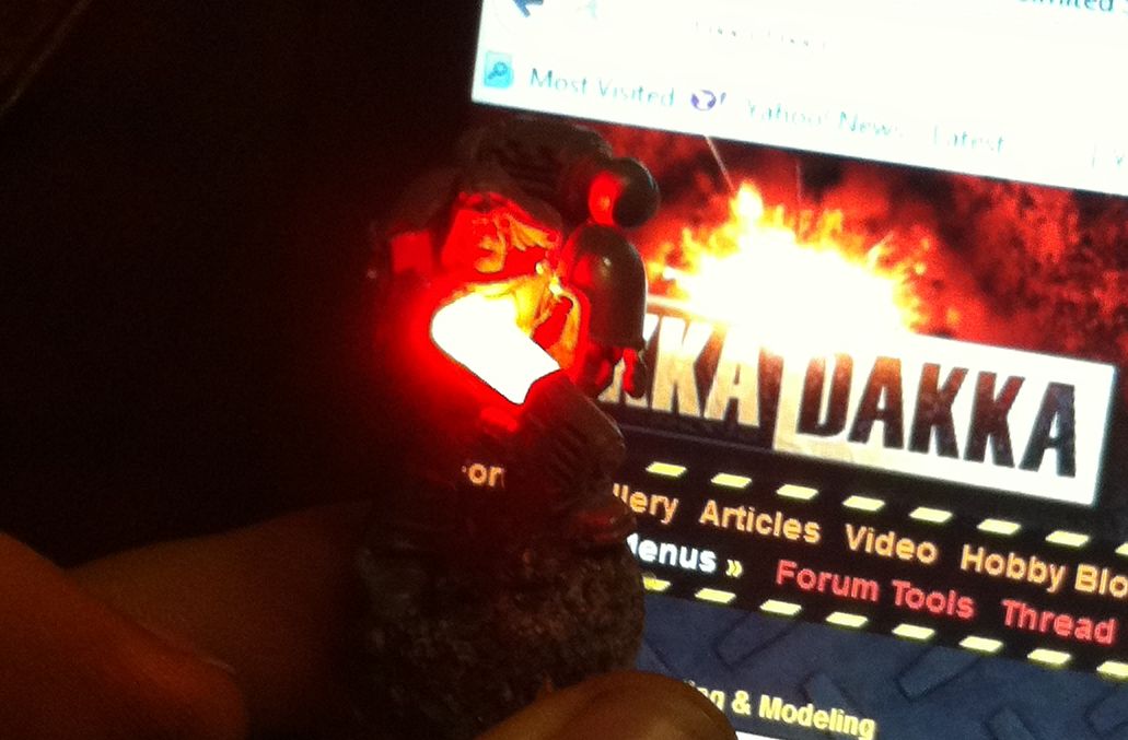 It is a space wolf that has been wired, modified, and converted to light up three different colors. Red, blue, or violet. Unfortunately the blue led is too weak to offset the red to achieve a visually noticable violet hue. The plasma coils are built out of a tiny chunk of a clear acrylic sheet. what kind of tutorial do people prefer? video or photo? as i can do either/or