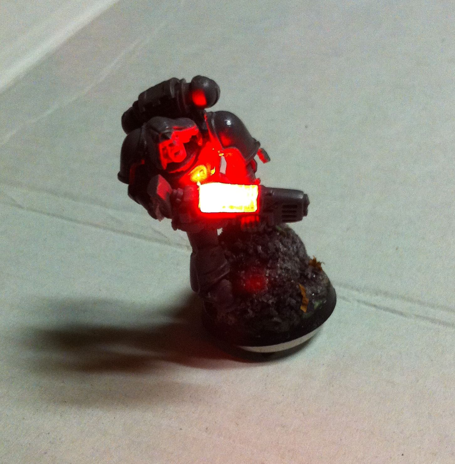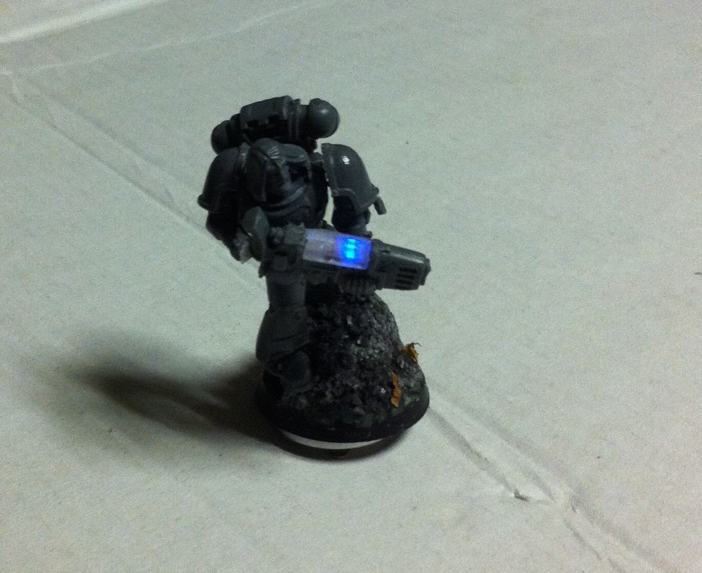 Just a random space wolf I wired up for practice. He was meant for 3 color but the blue diode is too weak to produce violet. His plasmagun started as a stock plasmagun and was modified with copper wire, a diode, solder, and clear arcylic.