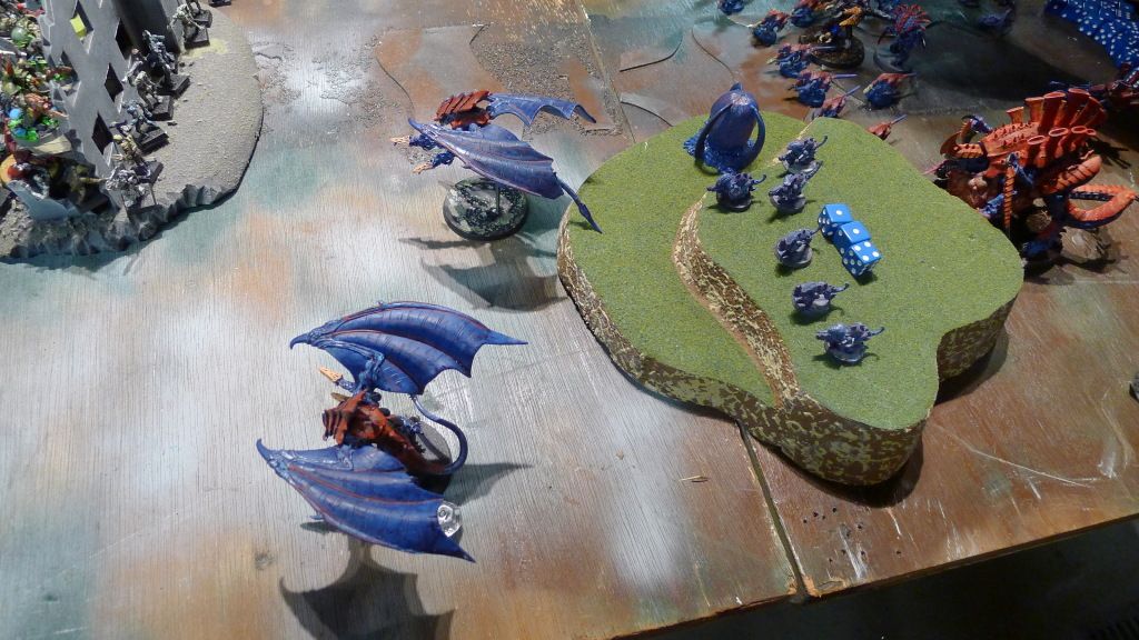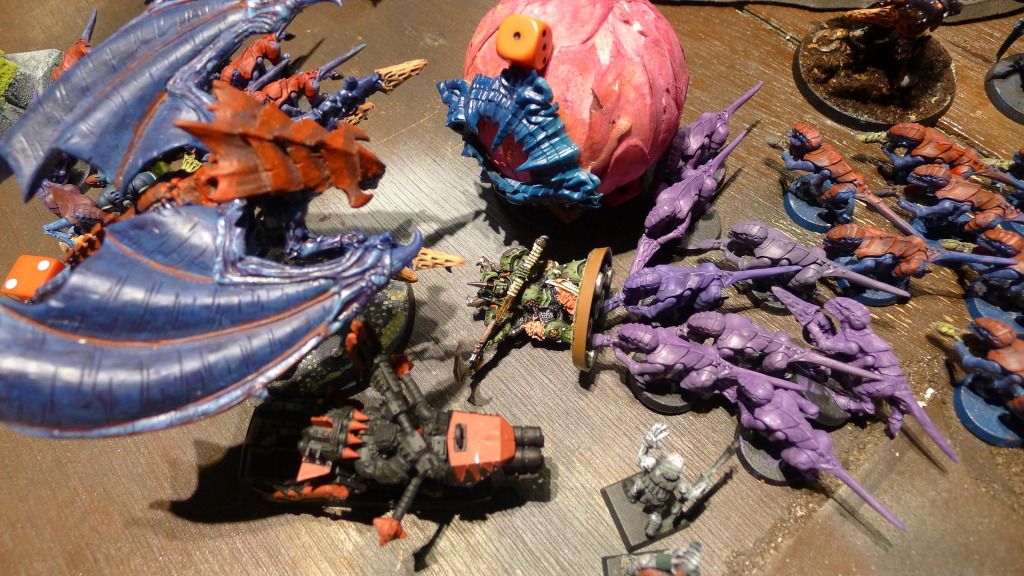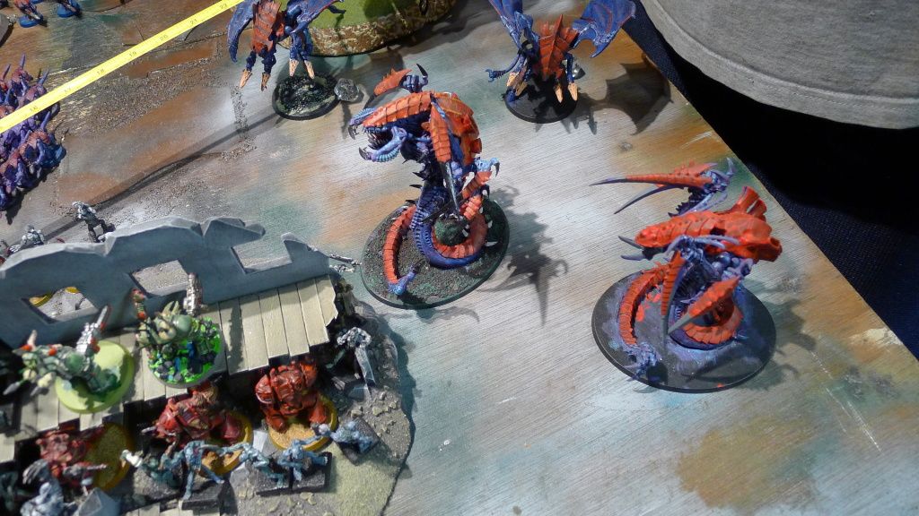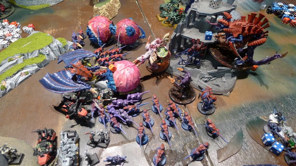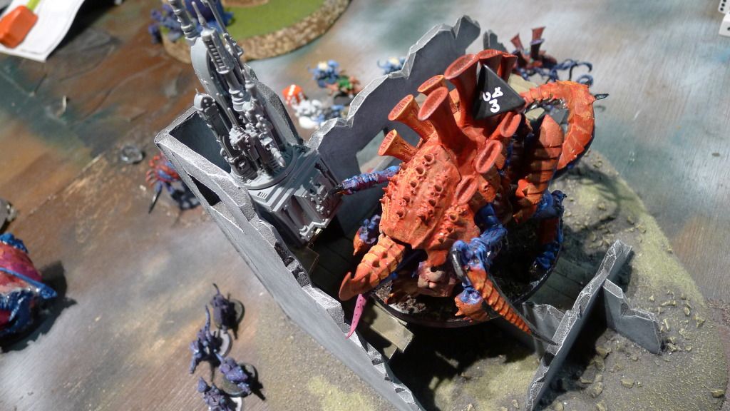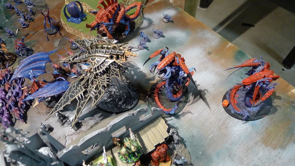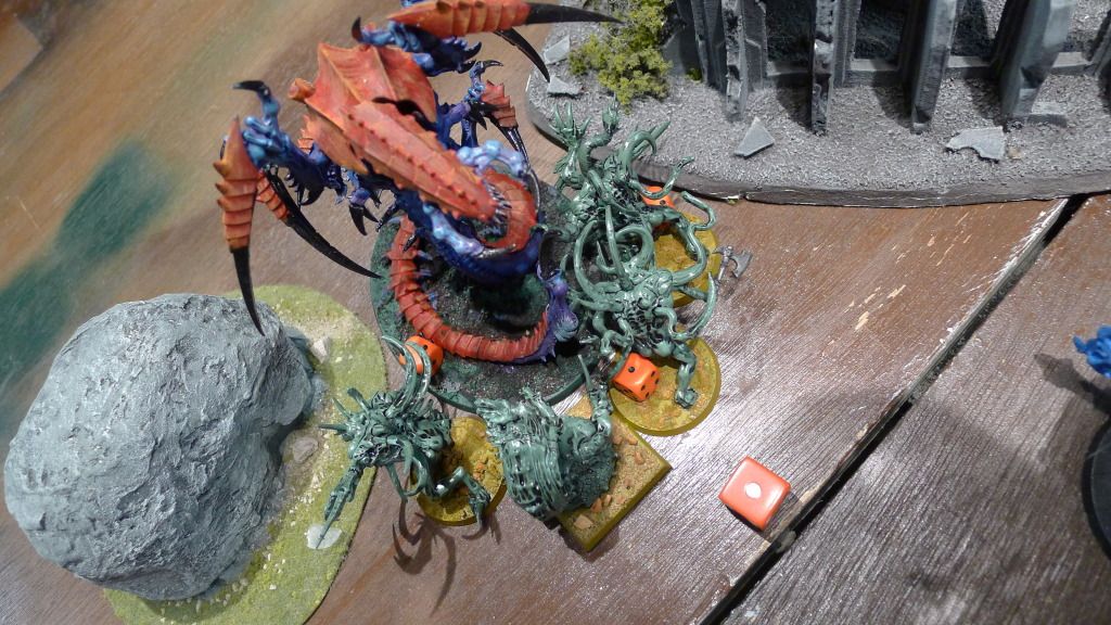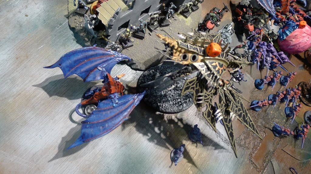 Killing those 2 flyrants made it somewhat easier to bear, and now my opponent does not have anything that can really hurt my heldrake. Now I just have to deal with 2 tervigons, 1 trygon, his Warlord and a lot of gants.