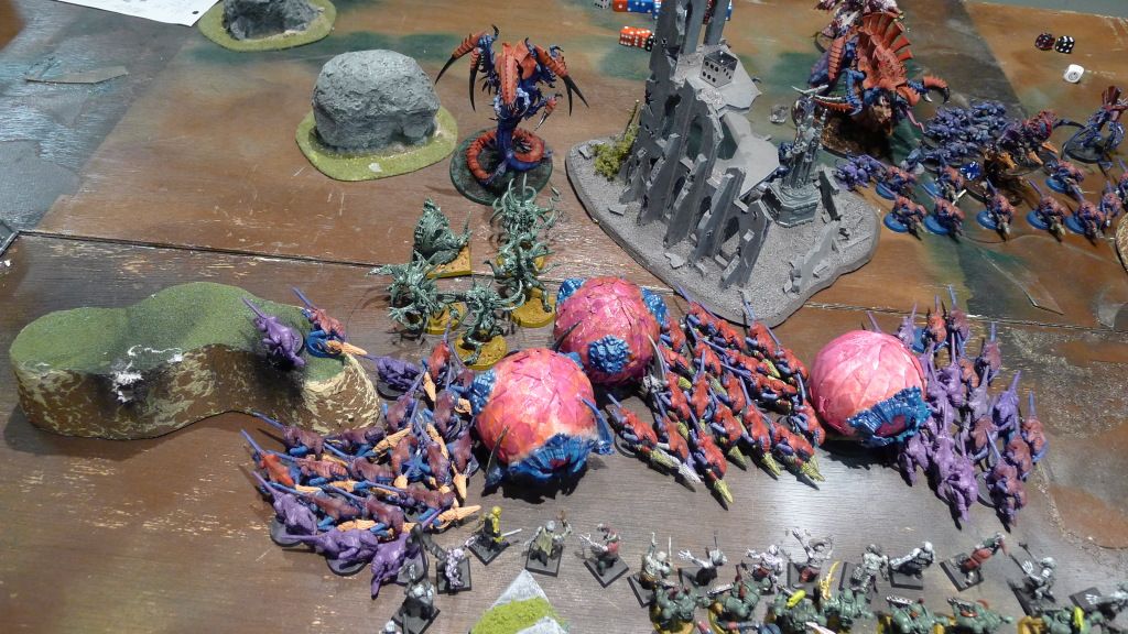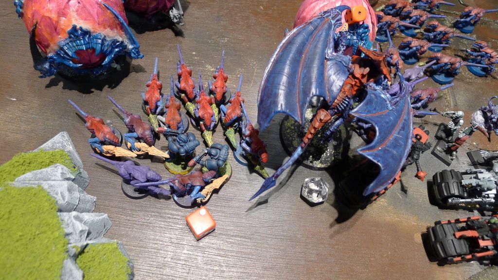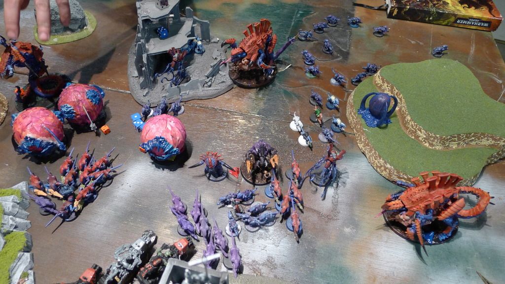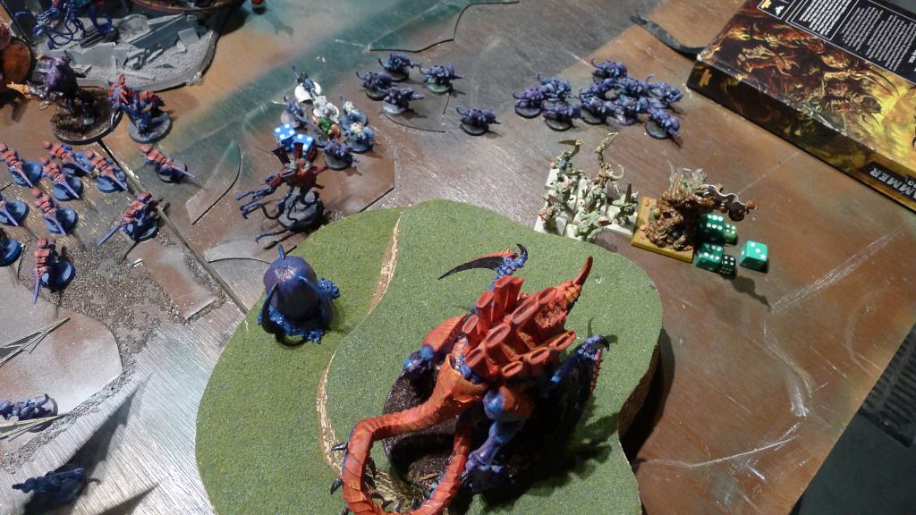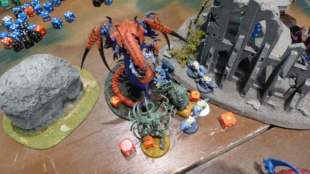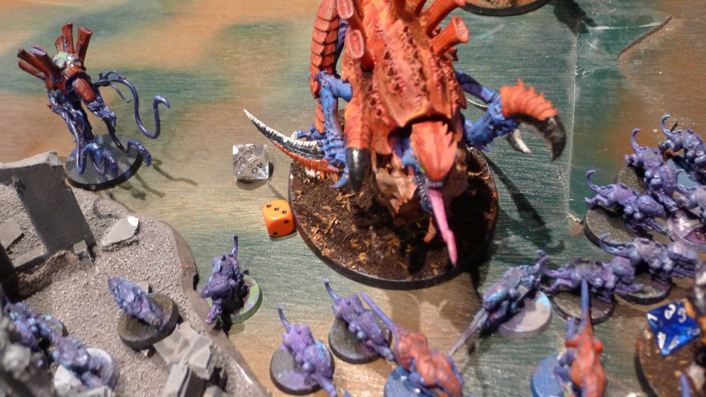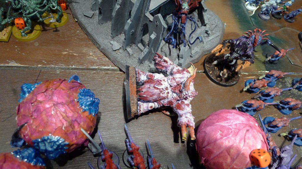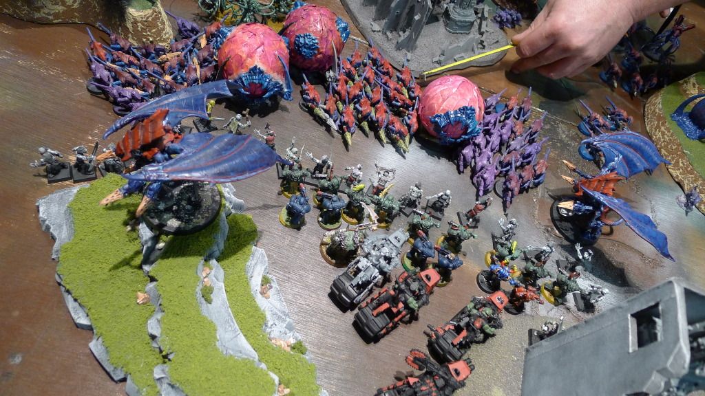 Killing those 2 flyrants made it somewhat easier to bear, and now my opponent does not have anything that can really hurt my heldrake. Now I just have to deal with 2 tervigons, 1 trygon, his Warlord and a lot of gants.