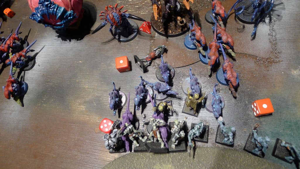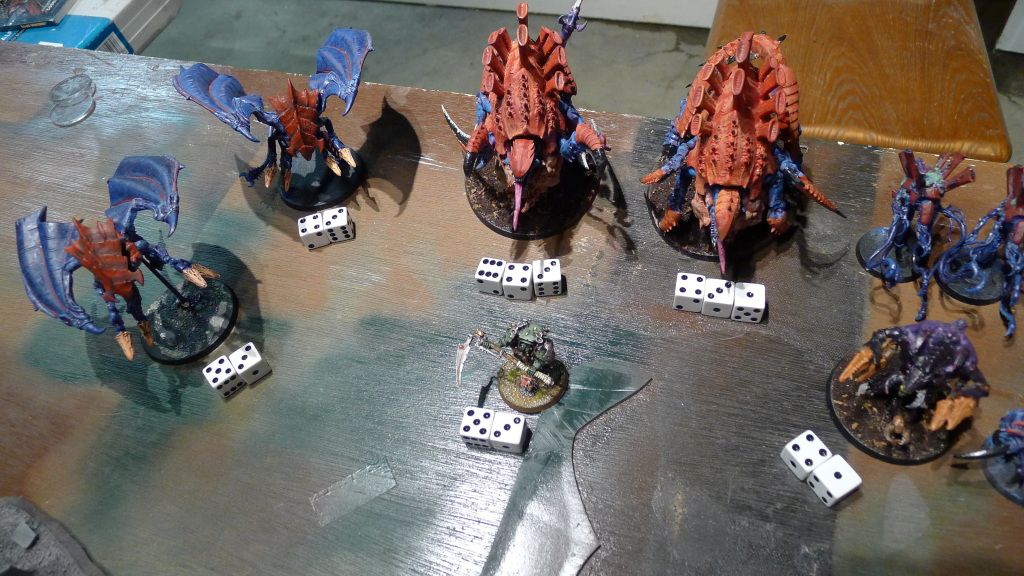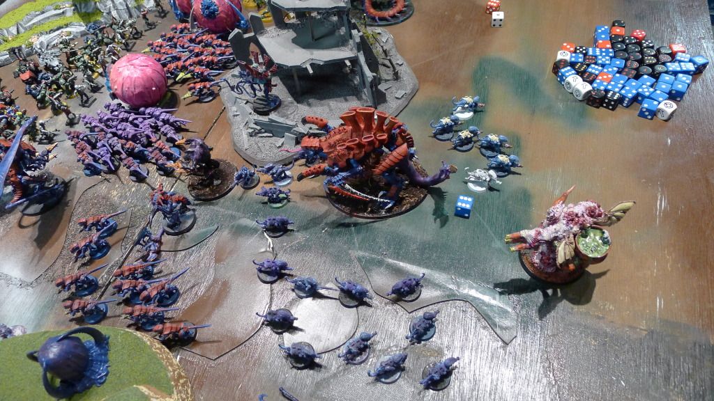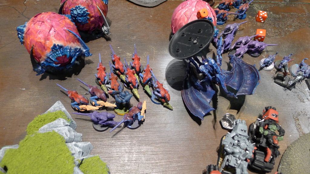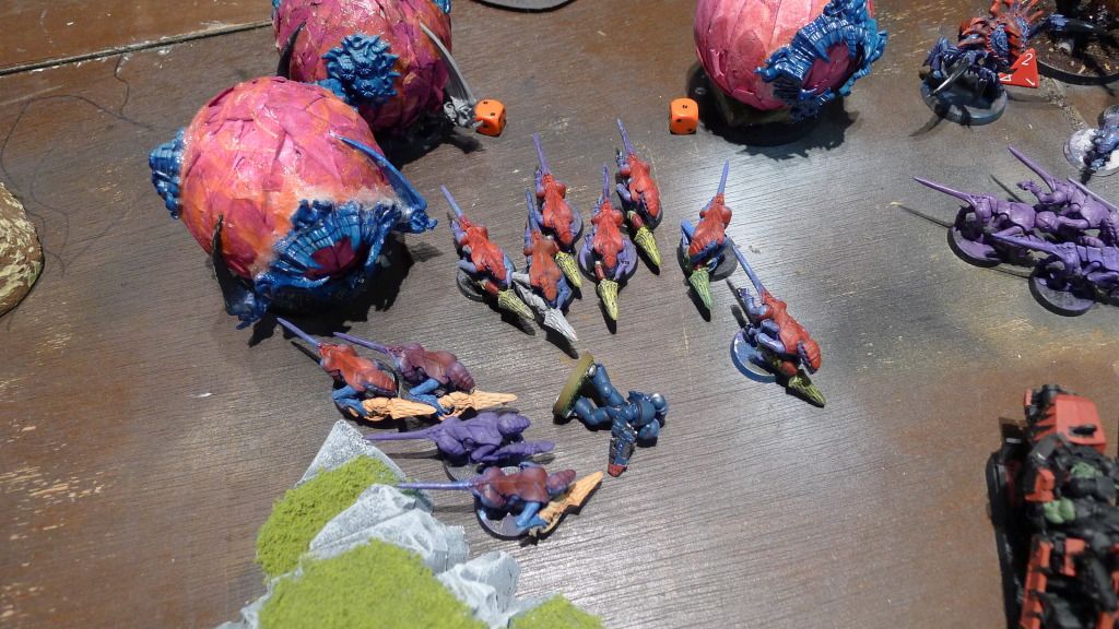 Tervigon spawns 6 gants and craps out. Flyrants swoop forwards.