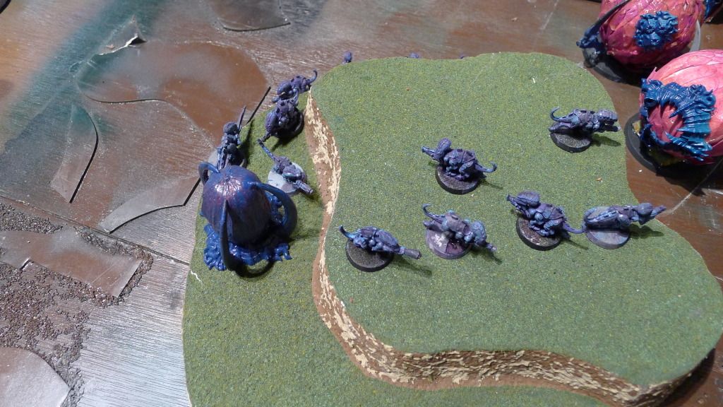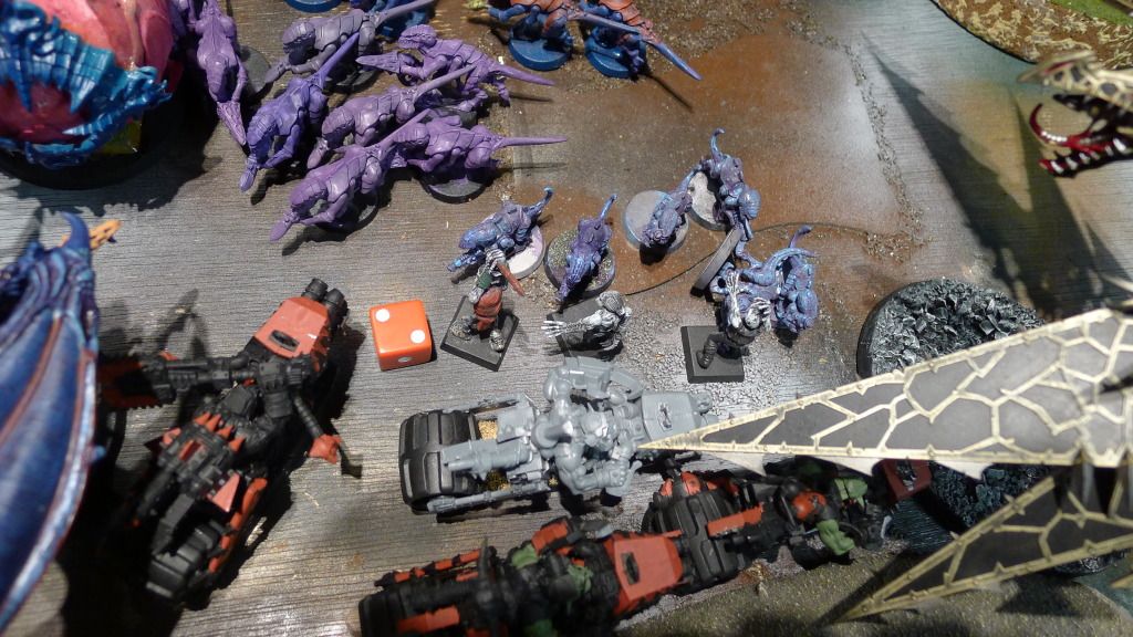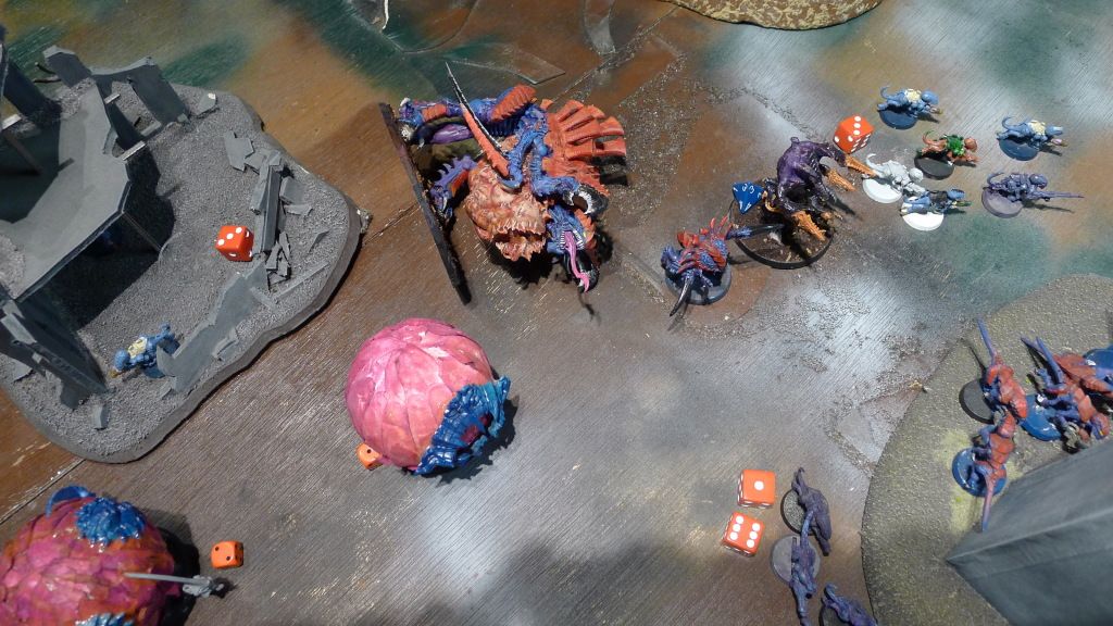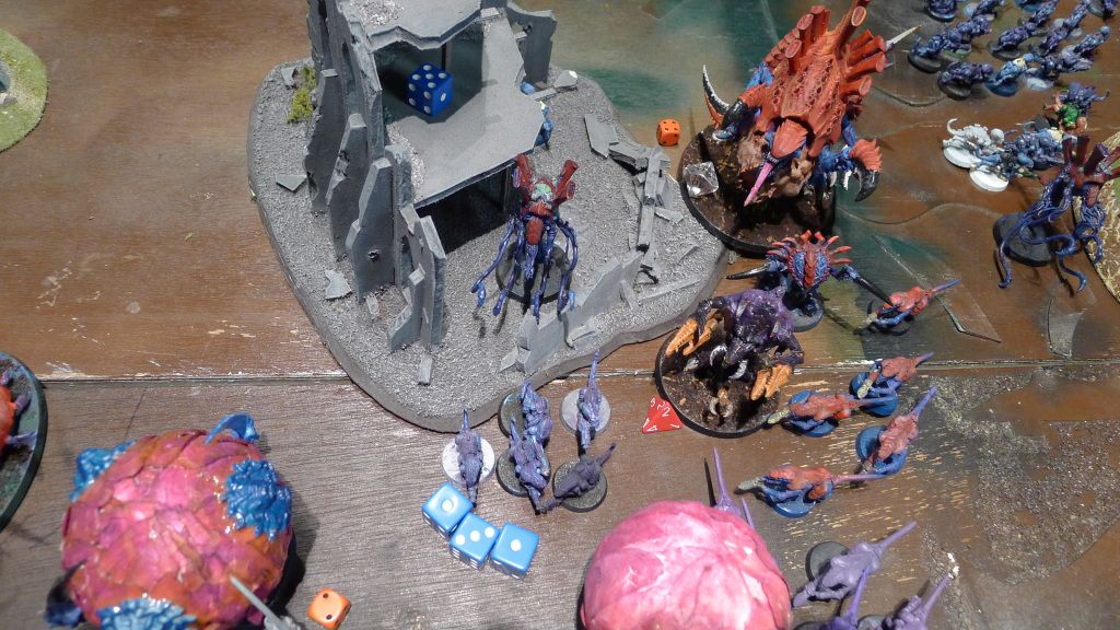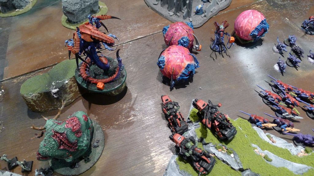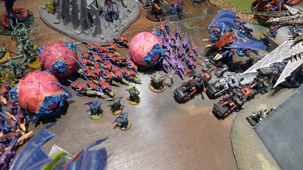 Tervigon spawns 6 gants and craps out. Flyrants swoop forwards.