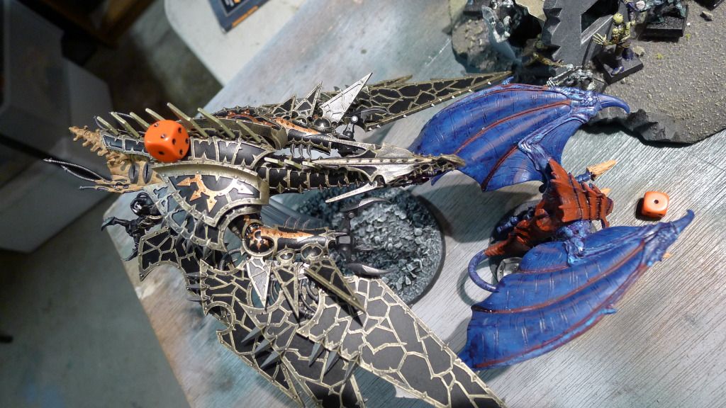 The other flyrant glides behind my heldrake and strips it of 2 Hull Points. He would have brought it down had I not made 2 5++ saves.
