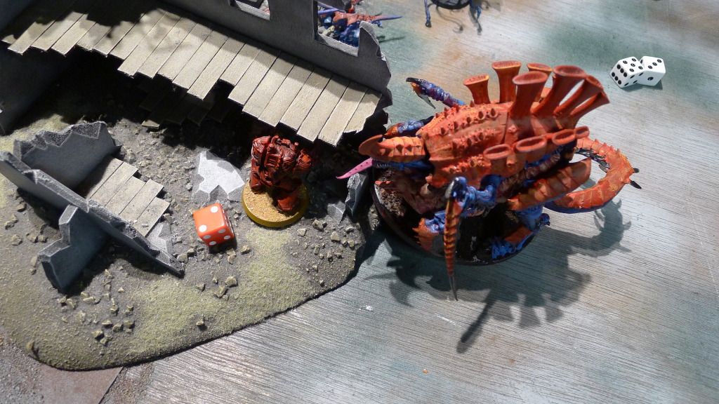 Now that Ku'gath does not need to go contest the objective, he goes after the spores. Shooting and then assault kills off both spores.