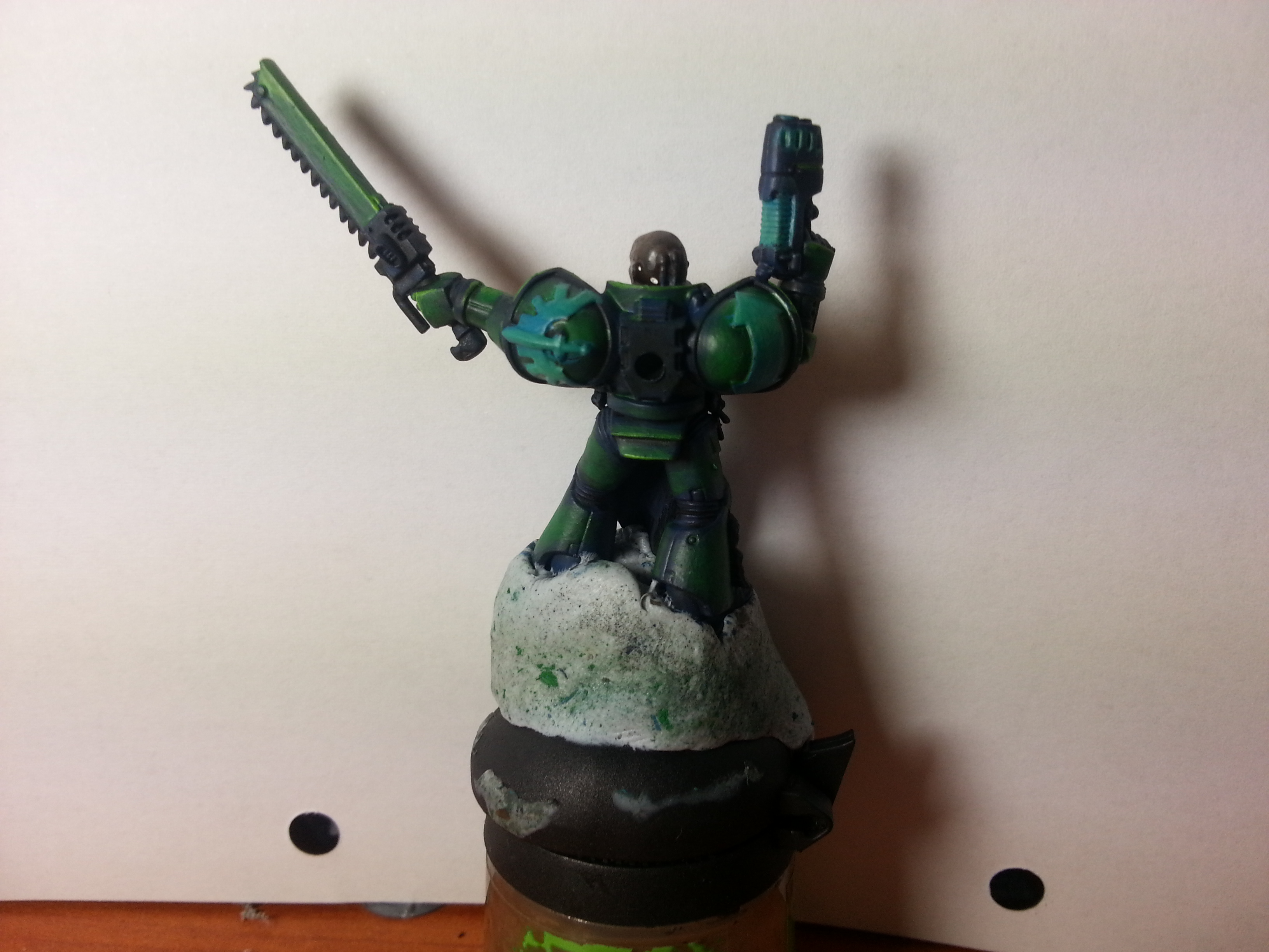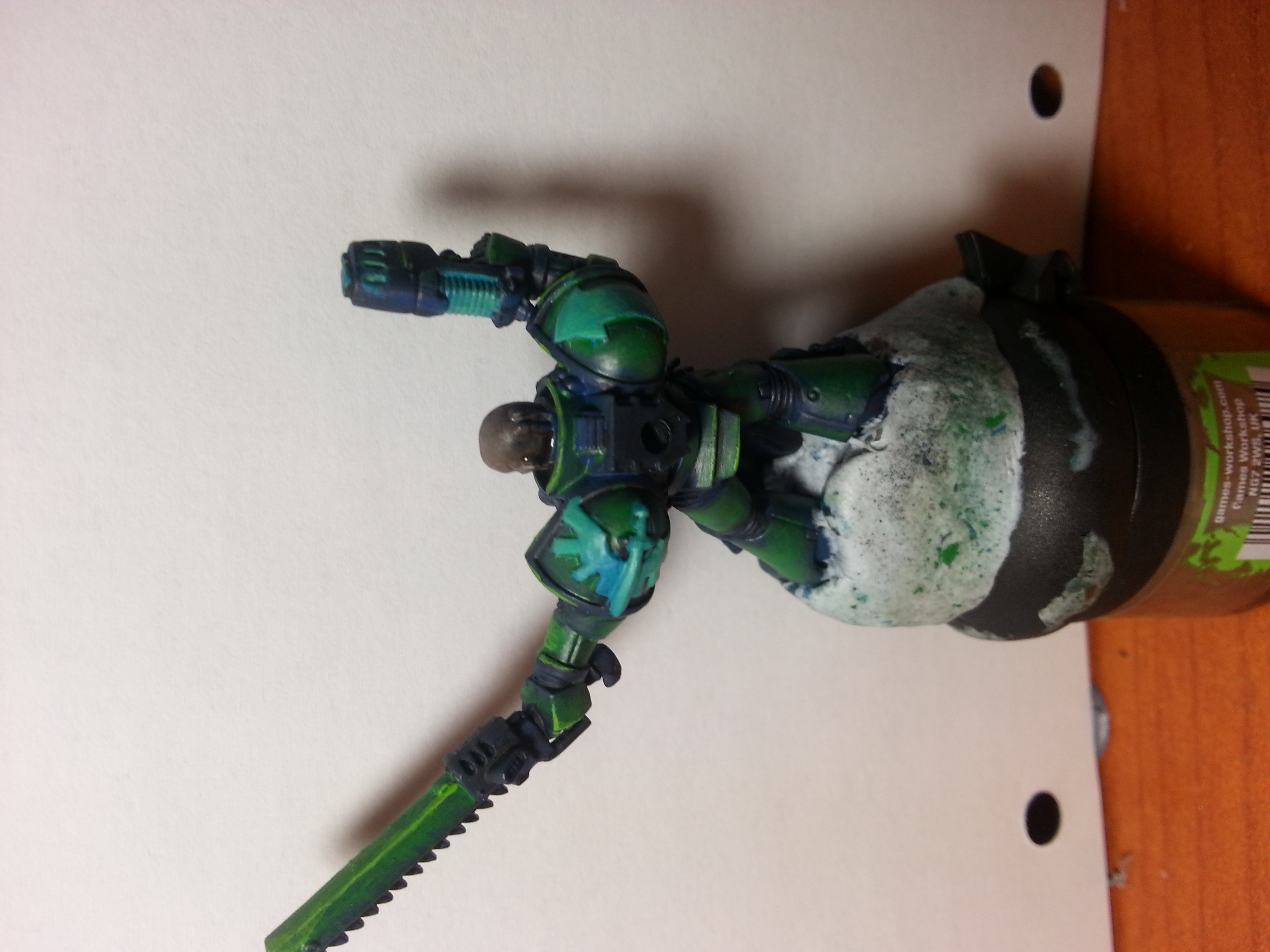 i have been playing around with the space marine armour. i want the armour to be different to the cloaks as i want to have the marines with cloak. some of the pictures i have seen alpha legion pics with cloaks and i like the idea. i also think it sits well with the fluff. i been looking around at some how to paint alpha legion and tried out what i think could work. i did it in a rush so the brush work is all over the place and its not fully painted. just want to get some paint on a mini to see if it could work.