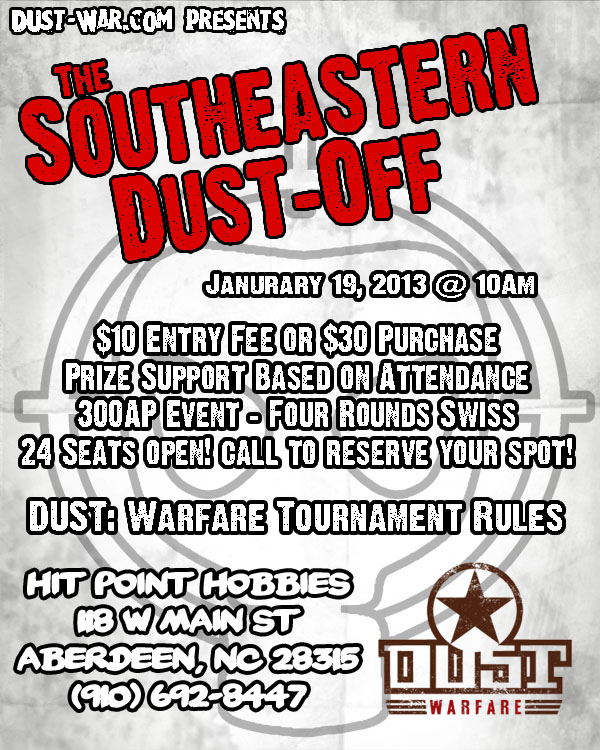 Dust-War.com are bringing the Southeast the first major Dust: Warfare tournament! Currently, you can call to sign-up or do so on