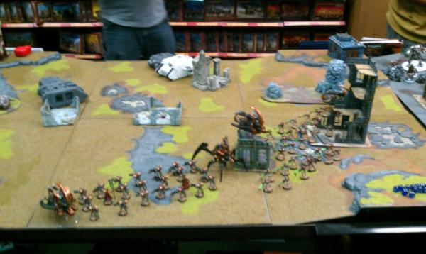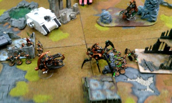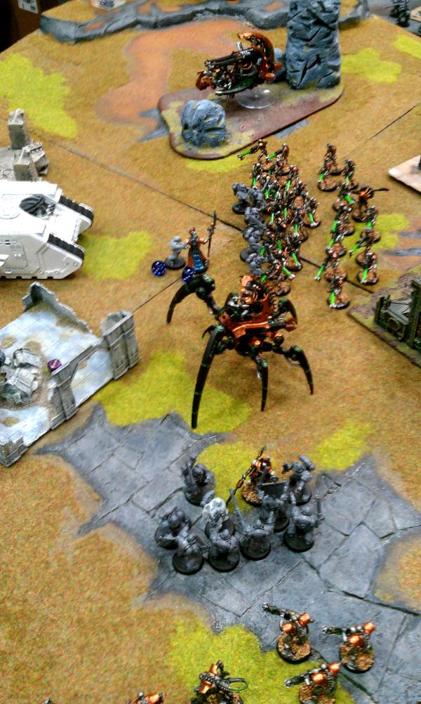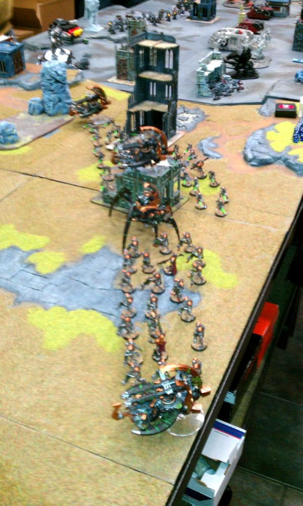 The Necrons array themselves in a battle line as close the the relic as possible, ready to fry vehicles with their gauss flayers and gauss blasters, ready to drown the foe in bodies. The Triarch Stalker centers itself in the center of the battle line, with barges taking the flanks.
