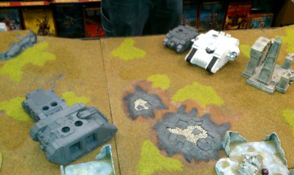 The Marines take a direct approach, using their land raiders to shield their rhino and vindicator.