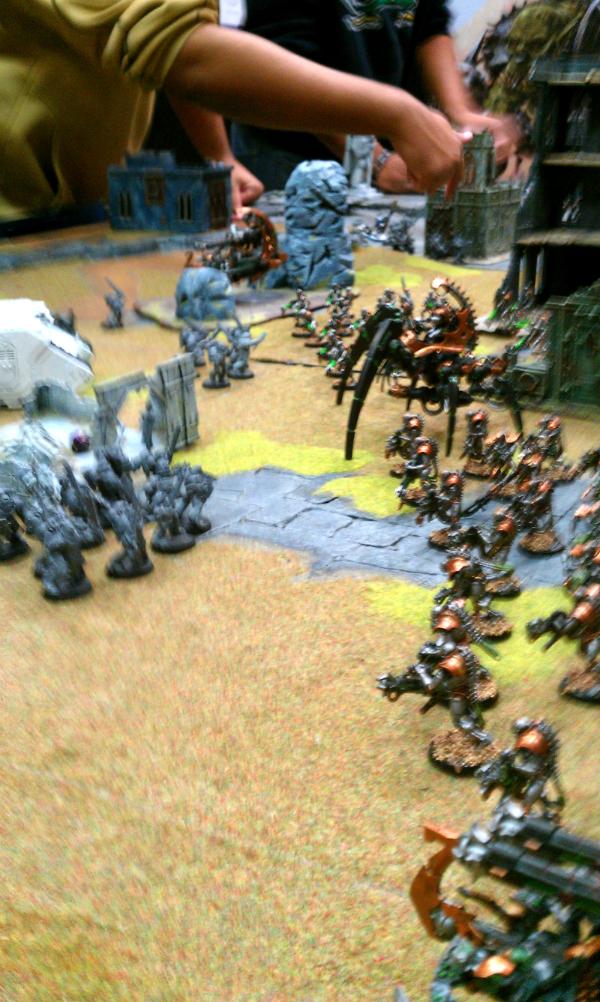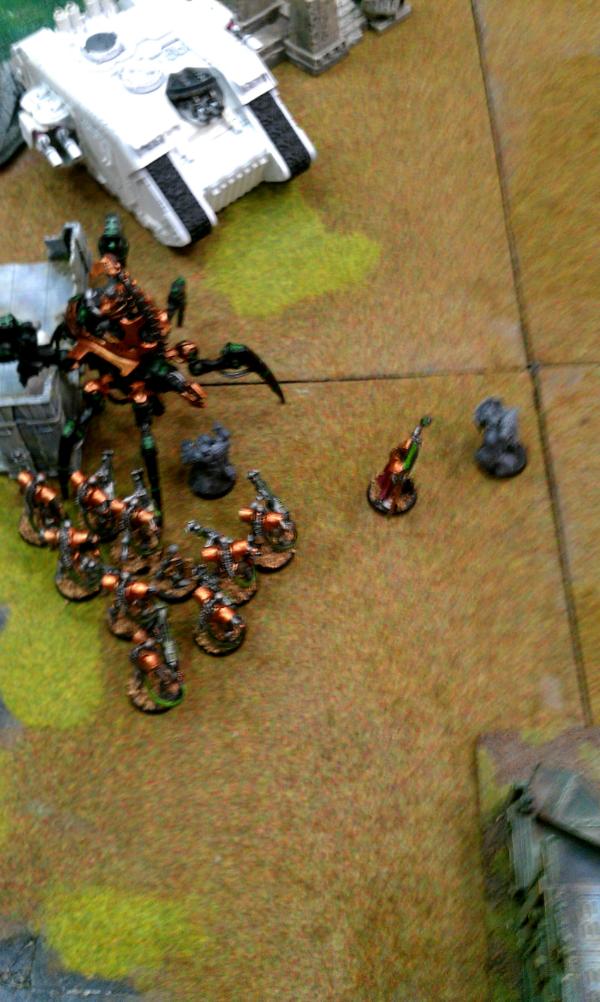 The company champion roars a battle cry, and races towards the triarch stalker mercilessly pulveriving his brothers, while the rest of the remaining marines charge the warrior squad, the chaplain beats down he cryptek in a challenge with ease. But the warriors trade evenly with the marines in wounds, and stay put, the cryptek rises once more to battle as well.