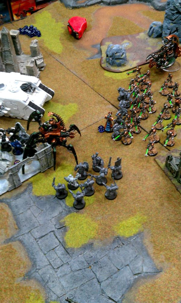 The Templar Vehicles Rocket Forward, firing lasacannons into the Stalker, which stands undamaged between its shielding and cover saves. However, the whole marine army is quite close to the Necrons now. The vindicator cannot fire, the land raider is blocking its line of sight.
