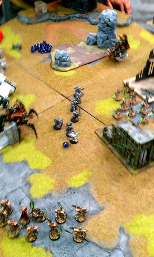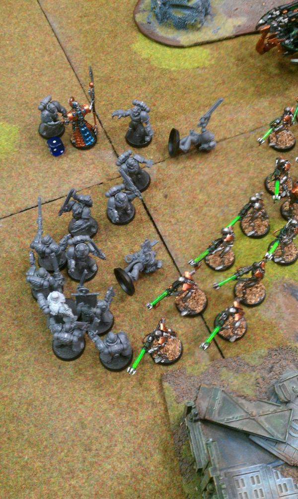 Simultaneously, three annihilation barges, a warrior squad, and the immortals all open fire on the command squad, thanks to strong armor saves and feel no pain, the squad hangs on just barely, their chaplain urging them on to finish the battle!