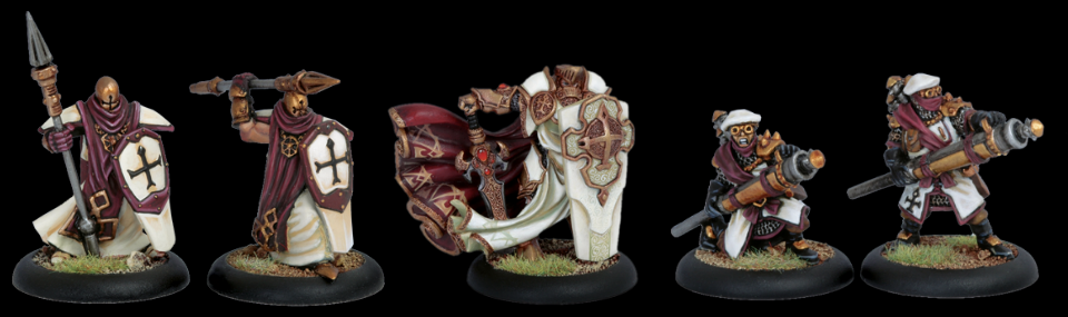 Units: Units usually form the bulk of the army, in numbers of models at least. Units can be infantry, multi-wound/heavy infantry, cavalry or artillery. Infantry can always be useful, and many of the units in Warmachine have some aspects that make them shine at some part of combat. A unit of combat infantry usually costs as much as a ‘Jack, and often has options to include a unit attachment (usually an officer who brings some fancy rules), or weapon attachments (such as rocket troops or flamethrowers) to customise the unit. There are other units that can be small, cheap support units, such as the Choir of Menoth, or kriel-stone bearers for Trollbloods.