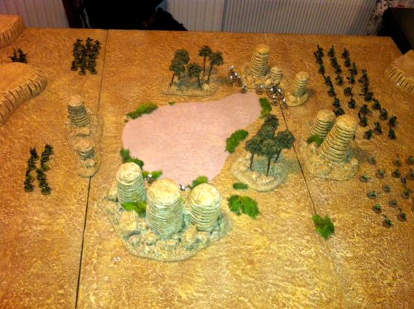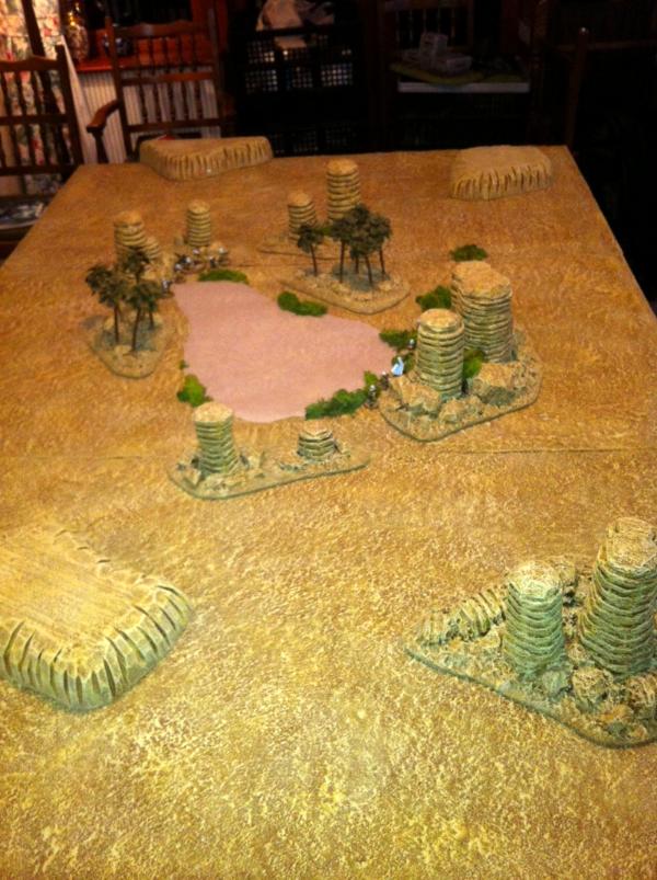 Here's those pics you asked for. This was one of the games in my campaign- Imperial Guard forces had to rescue a platoon of Tallarns at an oasis from an ork attack. The water is just some greaseproof paper.