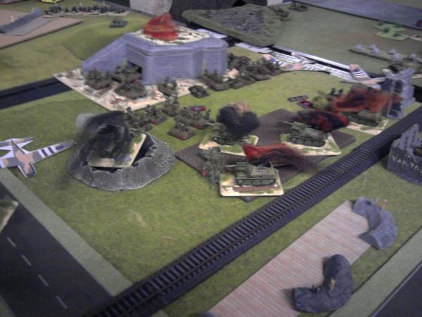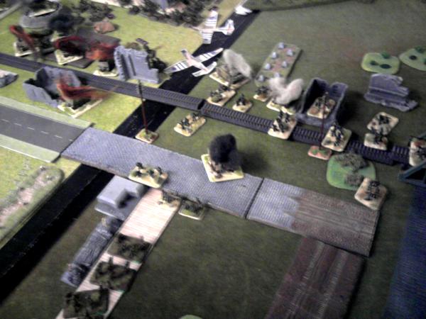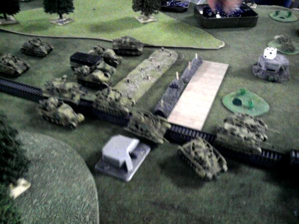 The Para 17 pounders and 6 pounders were wiped out, by the Kampfgruppe who got across the bridge, despite losing Panzer IV's. The Heavy Tigers got across and set to work on the Para's in the bunker. The German unit to the south was battered but somehow managed to hold despite losing all the artillery and well over 50% of their strength. The Northern OST Group was well and truly annhilated. The Germans managed to get hold 2 objectives, but the British Armour withdrew to superior positions and ring fenced the German breakthrough.