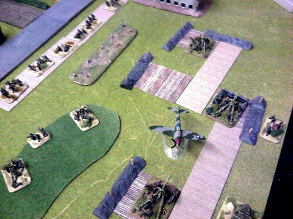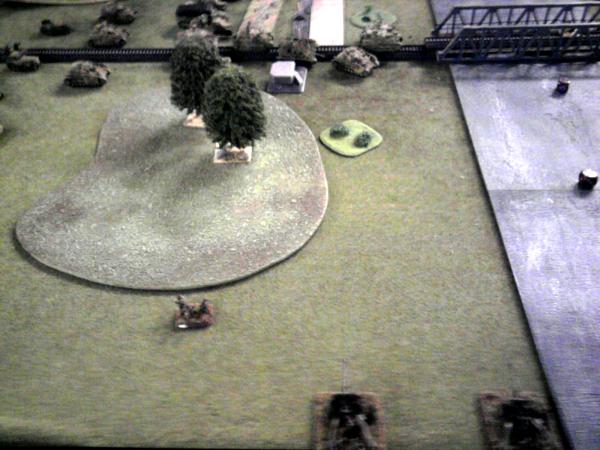 The 21sst Panzer Kampfgruppe Reach the Bridge and force their Infantry company across to secure it, and the Panzer IV's begin to follow, when *BOOM* the crack of a 17pounder whoomp's between the girders of the bridge. An extremely clever British NCO has positioned a pair of 17 pounder guns in an excellent firing position covering the Rail Bridge and the German Armour takes Murderous fire in it's flank and the shots pass straight through the German armour.