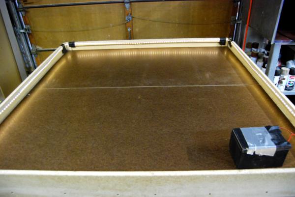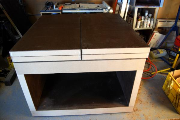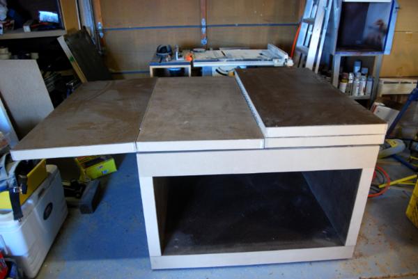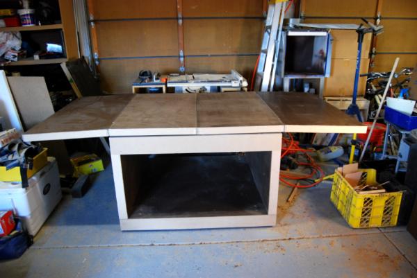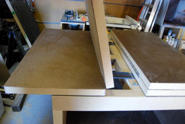 The hinges do protrude onto the table about 1/16" when it is in the larger configuration.  I plan to build 2'x4' modular table top with various terrain settings on them.  The modular pieces will have 1/8" rubber feet so they can sit above the hinge.  I also plan to store the modular table tops under the table on a yet to be built shelving system.
