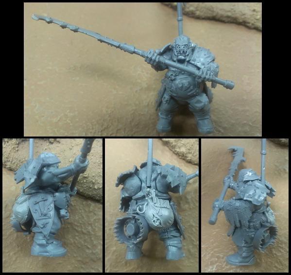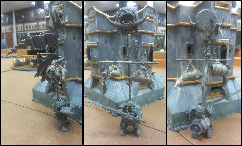 BSB mostly done with the addition of a crossbar with food from the Giant kit hanging from it (to inspire the Ironguts to give chase), a shield coving the back so I don't have to do anything especially creative to explain how the banner just stays in position, and a piece from the Giant kit used as a grieve on the left arm. I think the guy comes from the Thundertusk kit but I'm not certain. Sorry about posing the grey model next to a grey building. I'll try to avoid that in the future.