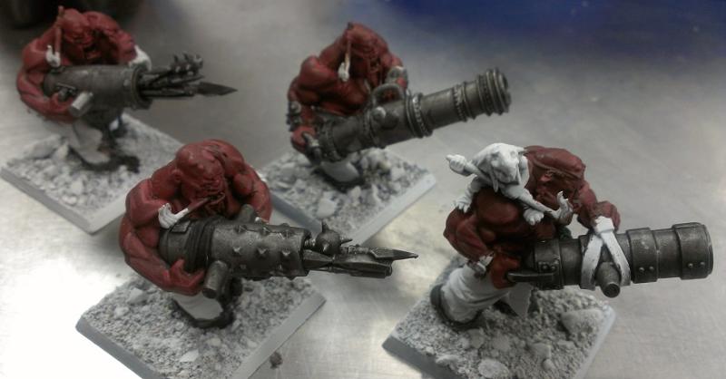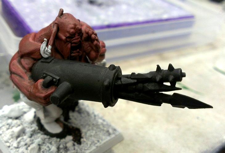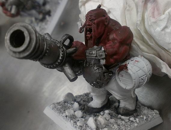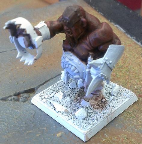 I used the body of the Ironblaster/Scraplauncher Ogre and the banner from the Mournfang. Having the banner trail behind the Bruiser keeps with the Rampagers Standard theme.
