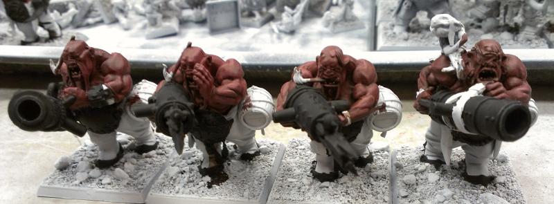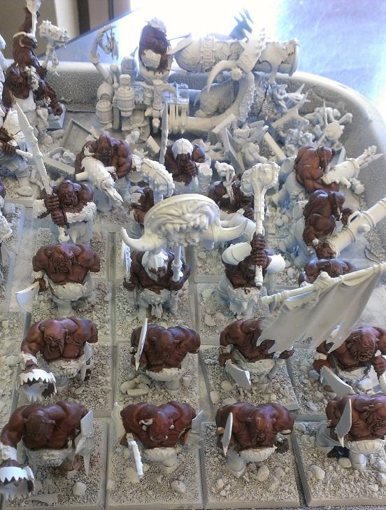 As before, I made a number of New Year resolutions. One was to finish my Skaven Army. Another was to get my Ogre Kingdoms army painted up. I am slowly (OMG so slowly) painting the rest of my rats, I've decided to dedicate some of my "construction time" toward preparing my Ogres for their turn under the brush. Most of the ogres have been built for a long time and most of my work now is gap filling the fat rolls where the arms join the bodies. Once that's all done, I've got to come up with some sort of basing scheme. I want something a little more interesting than dipping them in glue and pouring static grass all over. Maybe rocks and snow, if that isn't too difficult.