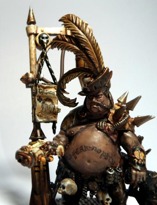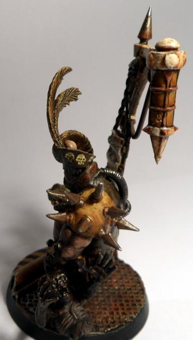 Abathiah is supposed to be an underhive crime lord who has grown monstrously rich (and corpulent) through his stranglehold on supplies of food, high-powered weaponry and great hats. I 'adapted' the name from Gormenghast's Abiatha Swelter and tried to create a character who might fit in with Mr Blanche's awesomely grotesque creations - at least in terms of the overall aesthetic; I don't claim to be anywhere near as good as he is. With that in mind, I tried to stick to a reasonably limited pallette, used the most ornate plasma pistol I could find, added a bunch of superfluous spikes and air hoses and gave him what I can only assume is