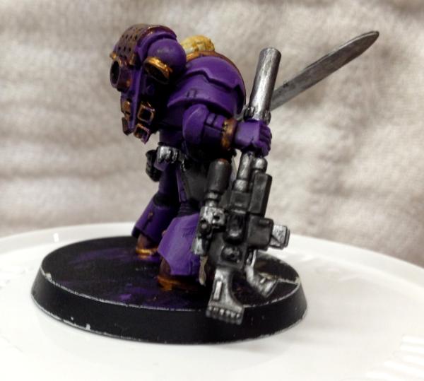SM Command Squad. Instead of using regular shoulder pads I went ahead and used the champion ones as I think they look cooler. The sniper rifle came from the scout sniper box and the sword is a pretty standard one. Also, I have a base coming from