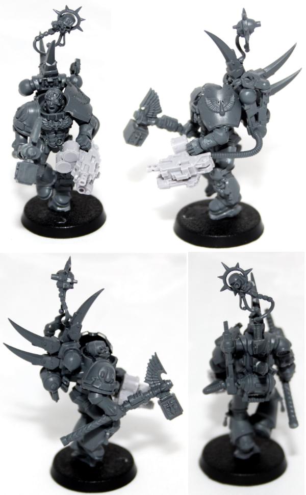 I have built up one shoulderpad as an overly large "siege" pad for extra defence, given the combi weapon additional support from the backpack aswell as adding additional tech to the powerpack and given him a Thunder hammer (only weapon that made real sense to me) and melta bombs (more for fluff than use).