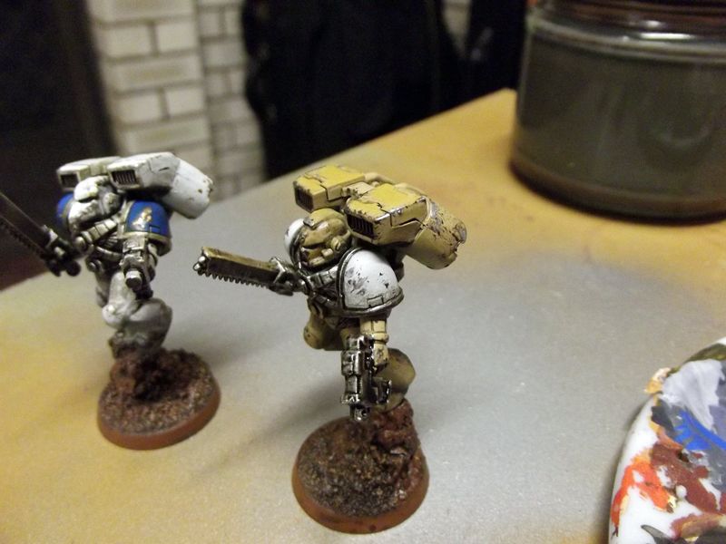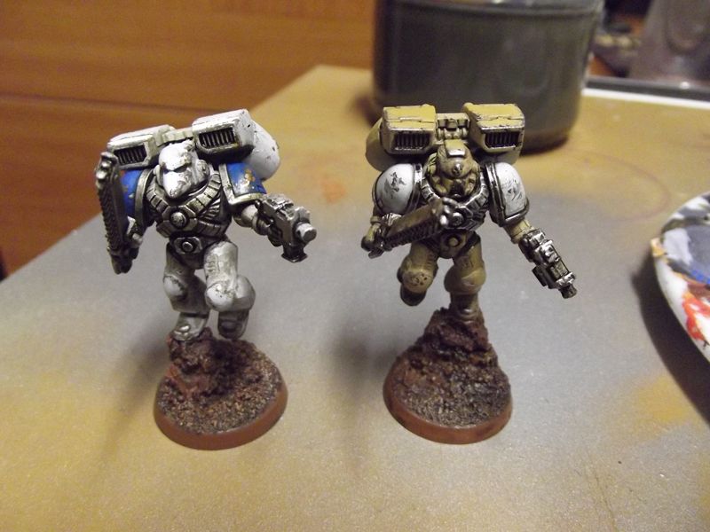 I am not satisfied with the straightforward Dark Angels colour pattern, so I've been ruminating on a suitable scheme for the past 2 years since I've finished assembling the majority of the army. Here are the fruits of my efforts. I have come up with the these schemes based on colours I have seen and liked, colours I can get in a spray undercoat, simplicity, effectiveness and eye catching. It isn't easy coming up with a scheme that encapsulates all of these elements. I have settled on these two, but can't decide which I like more.