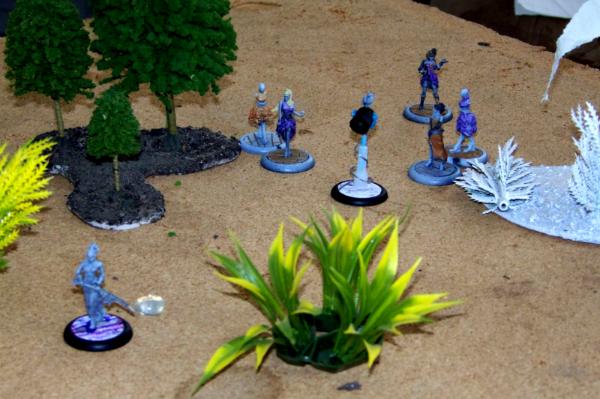 Not a huge update here, but a couple pictures to share. 1 of my crew so far, and 1 of the wifes crew minus 2 mechanical doves. Shes painting everything herself and I have to say, for being a total newb to painting, they are looking pretty good. And Im still kicking it around with finishing Pandoras face. I want the glow, so Im thinking Ill work on that a bit more to try and make her NOT look like a super villain, and I stil have some "grass" to add to the base. Anwyho, these were taken during a match we had