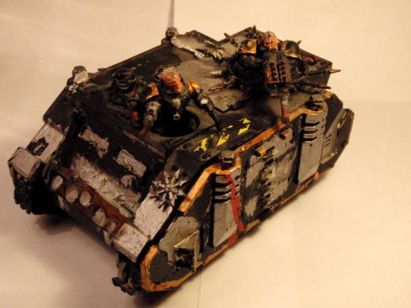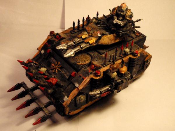 As you can see, the Rhino is in pretty bad shape. What you can't tell by the image is how poorly assembled it is. This picture was taken after I'd removed the several thousand spikes attached to this, it looked more like a daemonic hedgehog than a transport (except a daemonic hedgehog would be extremely cool, which this was not). Also, the Predator isn't much better, this again was taken after removing some spikes and seemingly random weapons that the owner had attached to the poor thing.