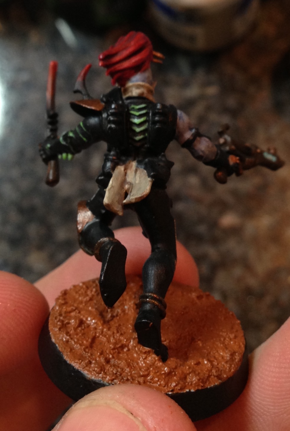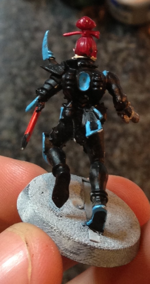 About the base I think I'll try flayed one flesh (edge paint) for the Drybrush. Then I have some tinylflat stones I will put in the base. Then I think I will add one of those DE spears with head on from another kit and paint it with blood running down it and onto the base.