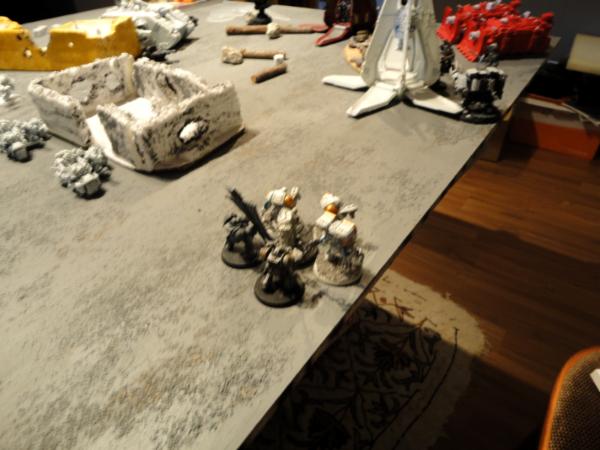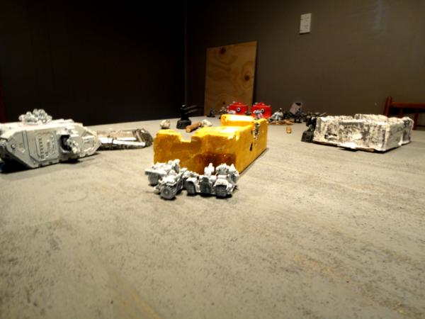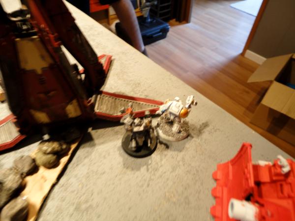 Sternguard, rapid fire 8 plasma shots, and fire 6 melta shots into my command squad, I loose 2 deathwing and he loses 1 guy to gets hot. Else where, another terminator gets killed by a drop-pod (those pods), and 1 terminator dies to the melta attack bikes.
