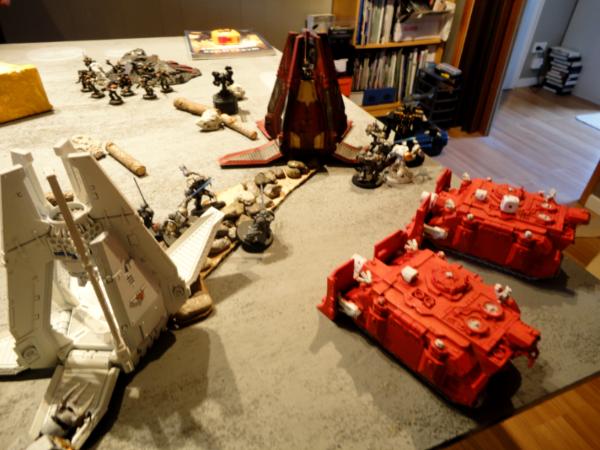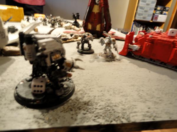 He chooses both his dreads to drop pod assault, leaving the sternguard behind, they both land right on top of my guys and the dreads get ready to melt some tanks. The right vindi gets immobalised, but the left one survives the attack, snapfireing drop-pods kill a terminator (story for the night, me failing 2+ saves )