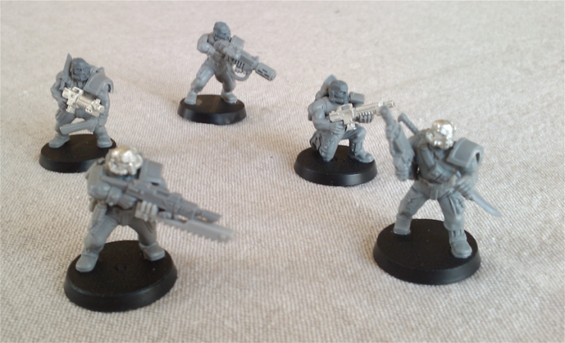 I've recently gone back to work on my 10-years-in-the-making Imperial Guard army. When I started it out, the only plastic infantry were the (horrible) Catachans, but I made the best of it and gave them all rebreather heads and a bulky shoulderpad to give them a less-Rambo, more-industrial wasteland feel. Because of the poor availability of bits, I picked up an old Blanche trick of using the old Space Marine shoulderpads, laid flat and cut in half.