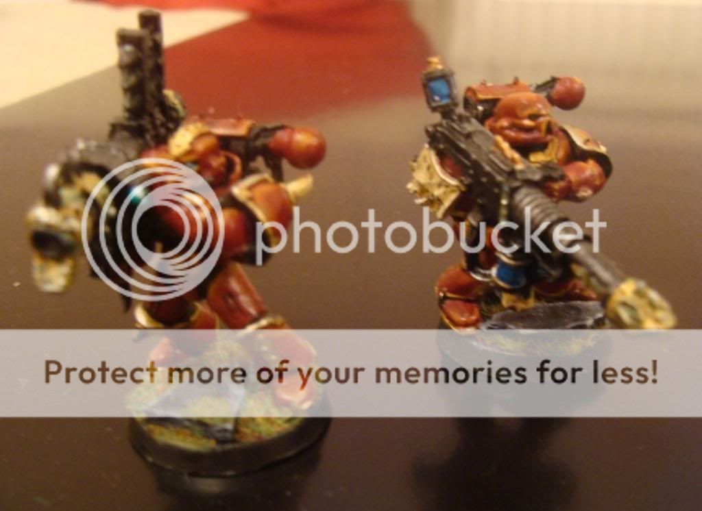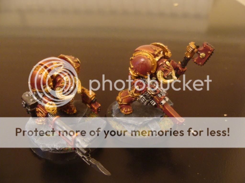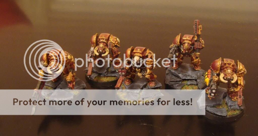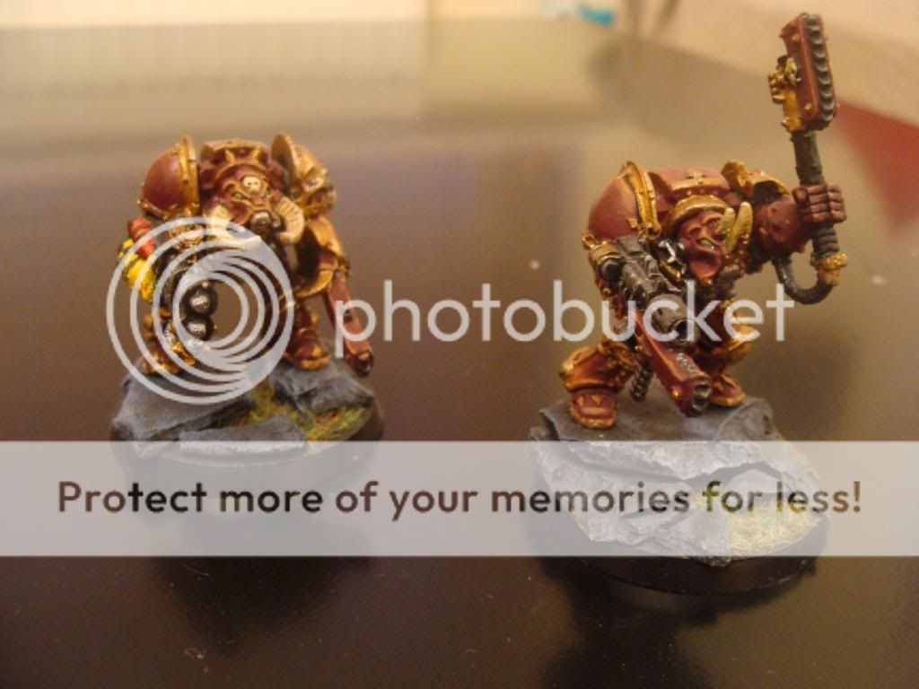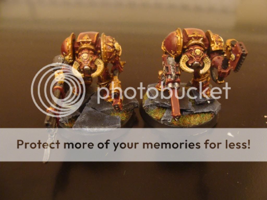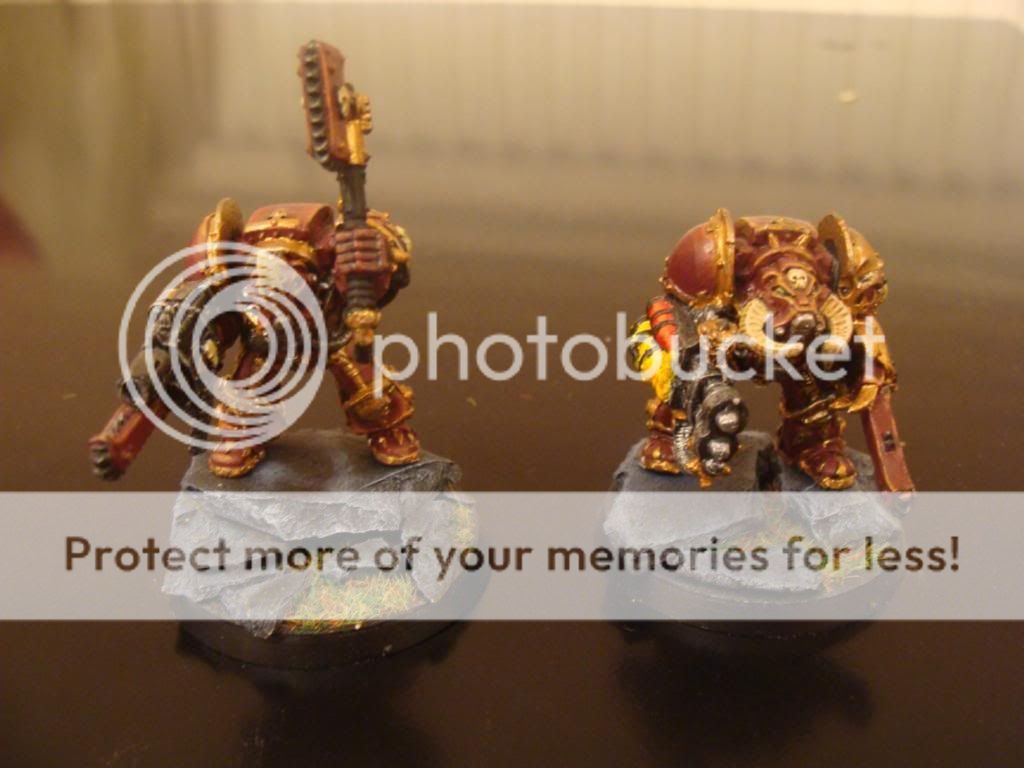 The first unit I painted were my terminators; I think the models are much nicer to look at than regular marines, and thus these are not the last terminators to be found in this blog! I was heavily influenced by an awesome Lord Zhufor paintjob I found on the web, where the painter had got this amazing terracotta type finish. My models ended up a little darker, but I am quite happy with the tone. I think the darker red-brown looks more sinister than bright red for the World Eaters.
