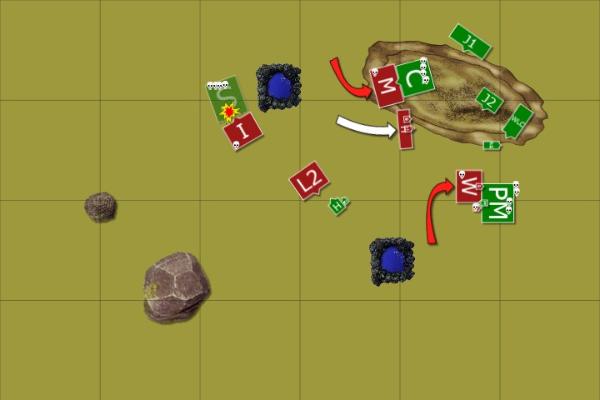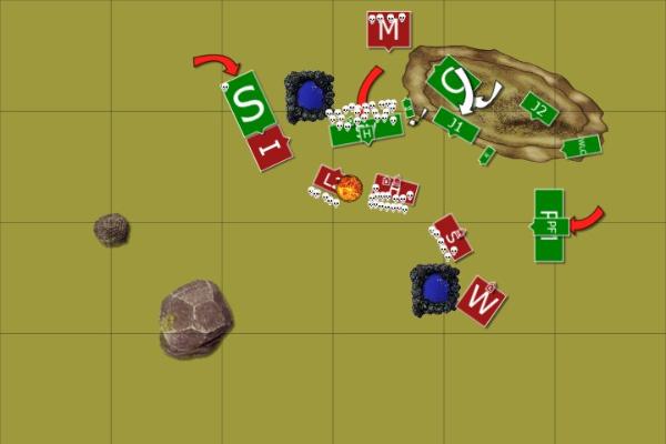 Once more the skaven guns boomed but once more Haskeer looked on helplessly as the warp lightning cannon fired short of Hjalmar’s warriors, the jezzails on the hill felled another hammerer (angles are a little off on the map) only for one of their ornate muskets to explode. To add further injury to insult the warpfire thrower, emboldened by the rattling gun fleeing past them rather than shooting at them, put full pressure into their weapon only to have it malfunction and explode in a spectacular fireball. Haskeer hung his head and began dreaming of great vengeances upon clan skryre.