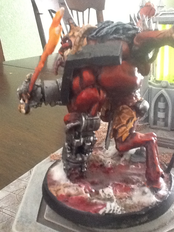 The original story of my daemon prince was that he was mortally wounded by Kharne and was granted ascension as his warband was interring him in a dreadnought. The DP models seemed wussy compared to a dread so I busted out the greenstuff and made this: