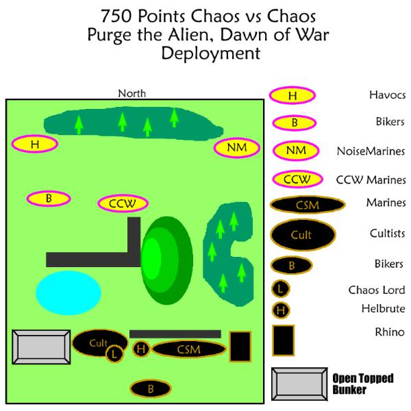The Black Legion Rhino pulled up close to the Noisemarines, smashing through the forest and immobilising itself before dropped off their Berserkers, as the other troops kept crossing the hill. When the Daemon Prince and Helbrute subsequently charged the Noisemarines, the Dirgecaster meant they were unable to perform overwatch.