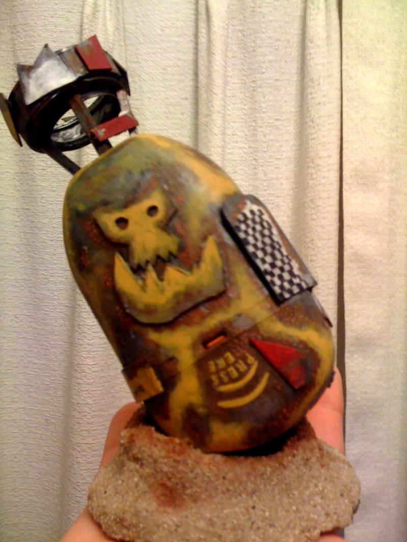 I was inspired the other day to put together a little Ork scenery piece. It's a giant unexploded Ork nuclear warhead that is waiting to randomly go off - or the poor gretchin who's job it is to manually activate the bomb. Sorry for the image quality. This is my first attempt at painting anything Orky - please comment and critique!