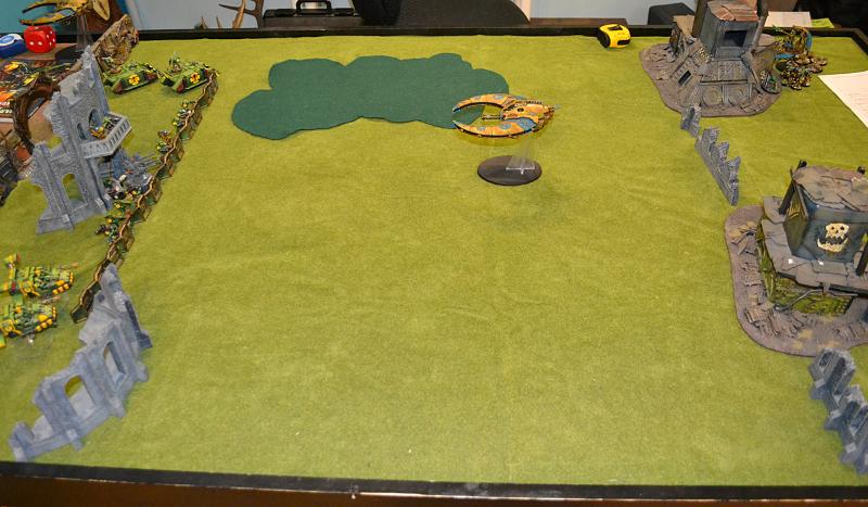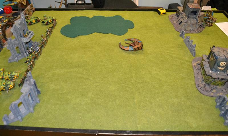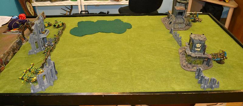 devs for a 3rd game in a row... used my wall and terrain to make a solid fortification about half way through my deployment zone. I also wanted to leave a nice open space in front of me for all my long ranged shooting. My son decided to do the same thing, and the table ended up like this.