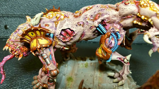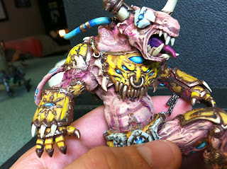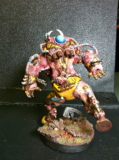 The greens in the Nurgle symbols are actually pretty simple: Base- Goblin Green, Highlight- Snot Green, Edge Highlight- Scorpion Green. The Blues are Base- Ultramarines Blue, Highlight- Hawk Turquoise, Highlight- Ice Blue. The guts were painted with a special blood mix that I made when I painted my ogre kingdoms army, then highlighted with Genestealer Purple and then (the legendary) Tentacle Pink! All these colors together with the yellows and oranges really make this potentially dark model, much brighter ... and in a strange way, I like it.